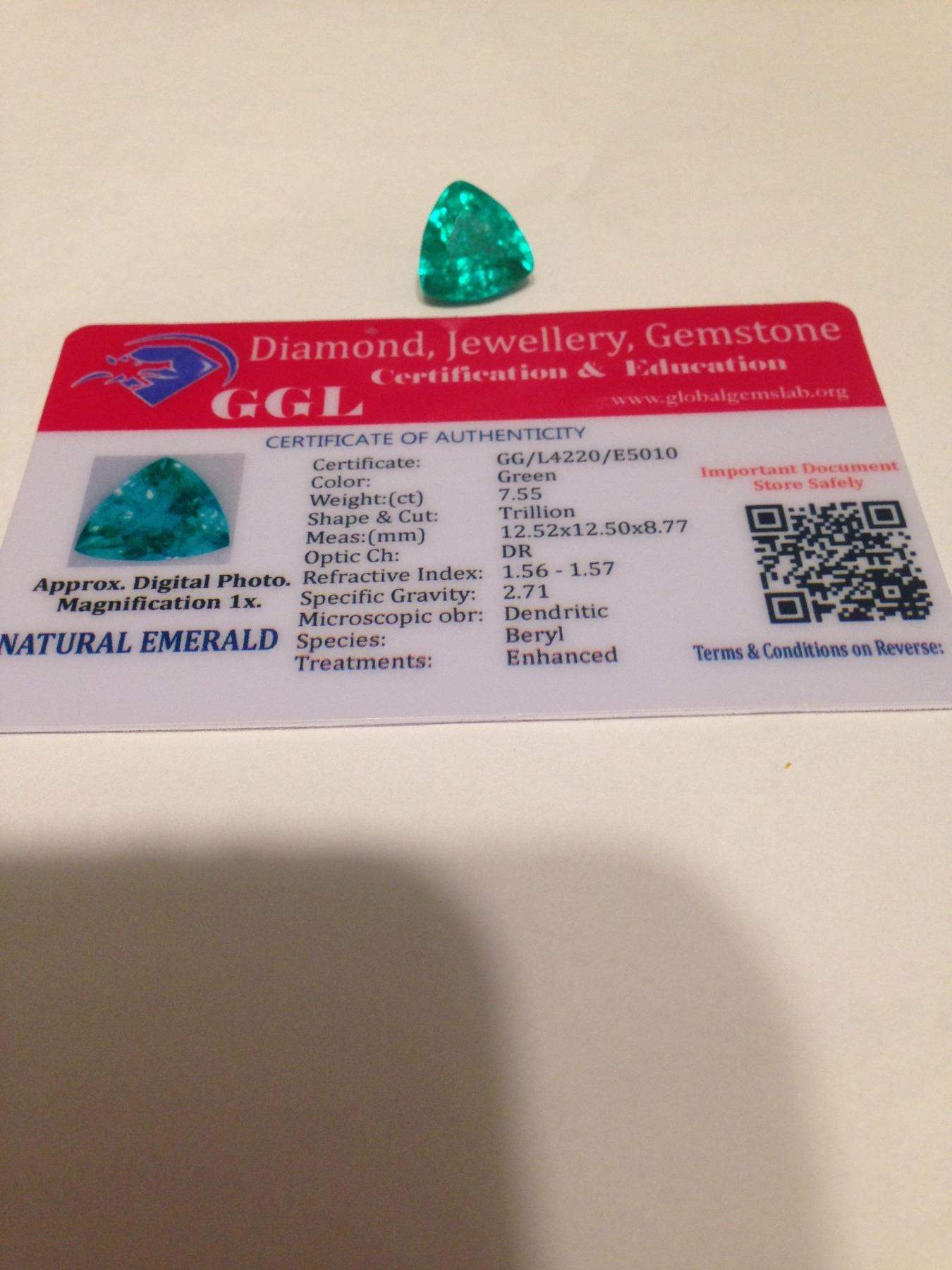 BEAUTIFUL CERTIFIED 7.55 CT COLOMBIAN EMERALD SOLITARE. THIS EMERALD DISPLAYS INTENSE COLOR SATRATION WITH A HIGH LUSTER AND A STRONG VIVID TONE. VERY TRANSPARENT WITH A FINE TRILLION CUT MEASURING 12.52 x 12.50 x 8.77 mm. EMERALDS HAVE LONG BEEN ONE OF THE MOST SOUGHT AFTER AND ADMIRED PRECIOUS GEMS FOUND ON THIS GREAT EARTH. READY TO MOUNT AND BE WORN. TREATED. PLEASE SEE CERTIFICATION FOR FURTHER DETAILS.