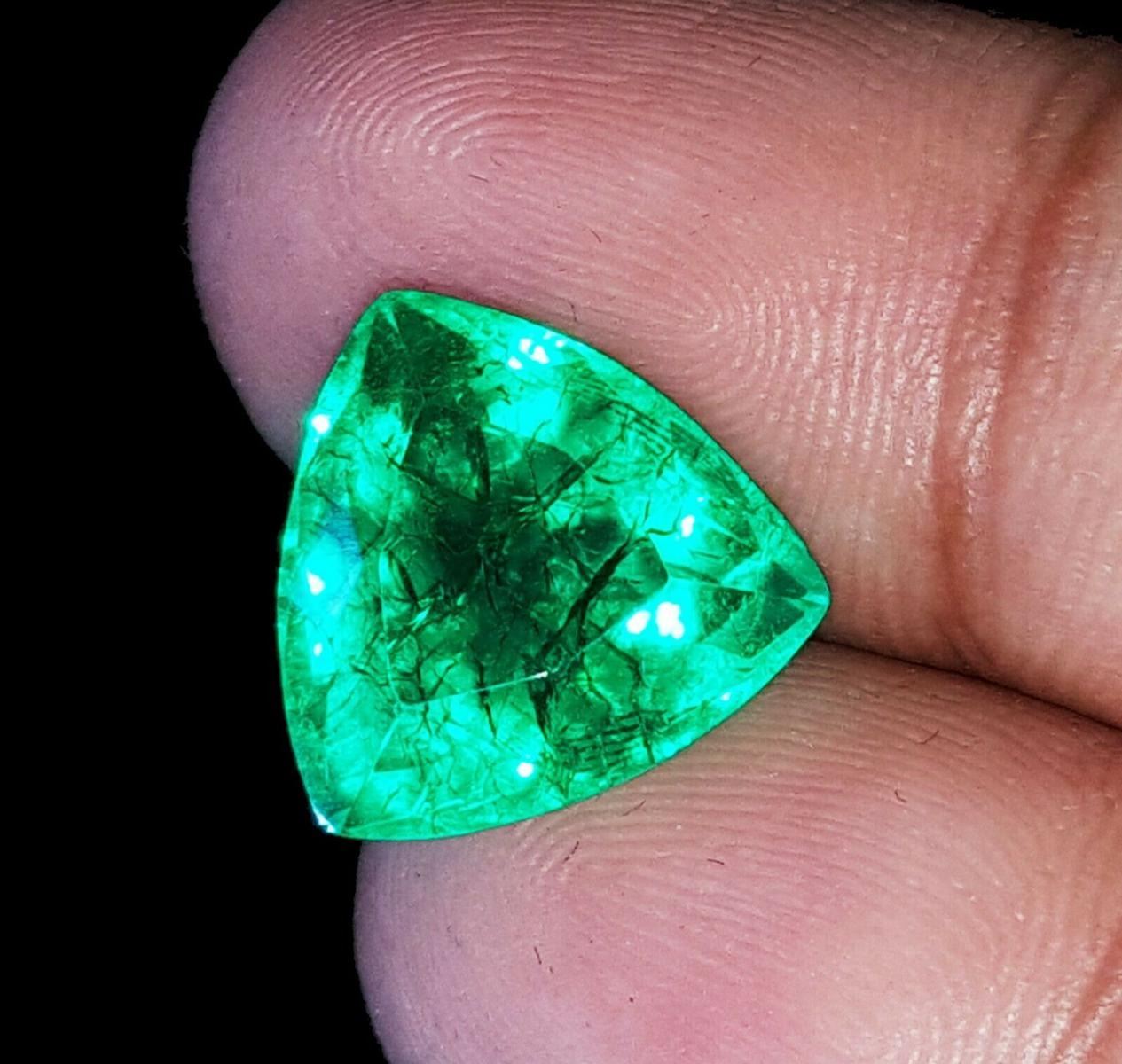 BEAUTIFUL CERTIFIED 7.55 CT COLOMBIAN EMERALD SOLITARE. THIS EMERALD DISPLAYS INTENSE COLOR SATRATION WITH A HIGH LUSTER AND A STRONG VIVID TONE. VERY TRANSPARENT WITH A FINE TRILLION CUT MEASURING 12.52 x 12.50 x 8.77 mm. EMERALDS HAVE LONG BEEN ONE OF THE MOST SOUGHT AFTER AND ADMIRED PRECIOUS GEMS FOUND ON THIS GREAT EARTH. READY TO MOUNT AND BE WORN. ENHANCED or TREATED. PLEASE SEE CERTIFICATION FOR FURTHER DETAILS.