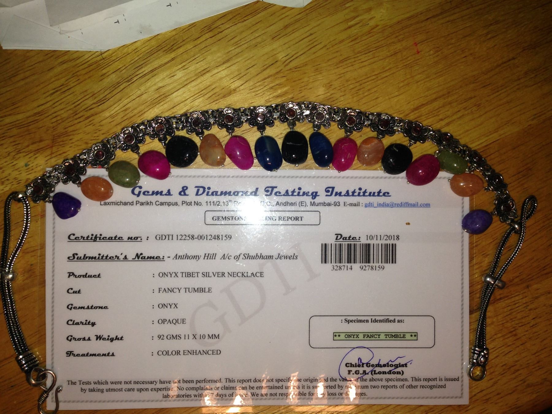 BEAUTIFUL CERTIFIED MUTI COLOR ONYX NECKLACE. 17 ONYX STONES COMPLIMENTED BY AMETHYST ACCENTS.MOUNTED IN .925 TIBET SILVEER OVERYLAY.APPROX 18" LONG WEIGHING 92 GRAMS OR 540 CTTW. PLEASE SEE CERTIFICATION FOR FURTHER DETAILS