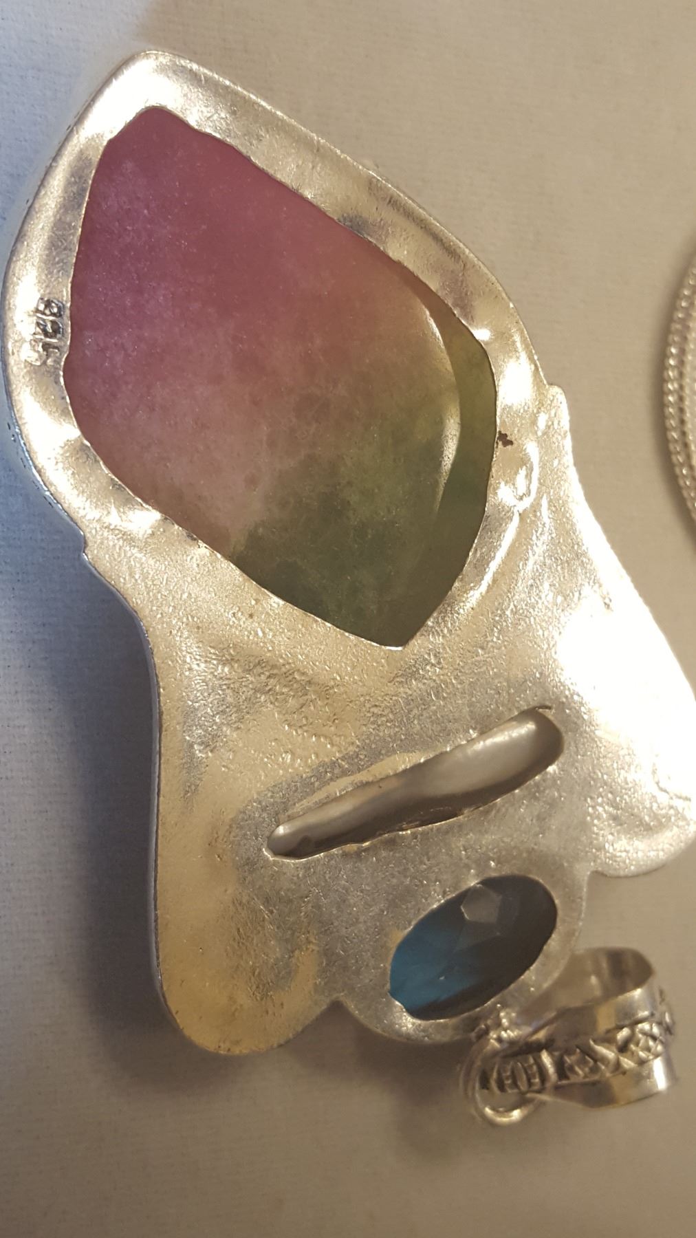 BEAUTIFUL HAND CARVED MULTI COLOR QUARTZ LEAF PENDANT. MOUNTED IN .925 STERLING SILVER.20 " LONG . INCLUDES 20 CHAIN. 27.50 TOTAL GRAM WT. STUNNING