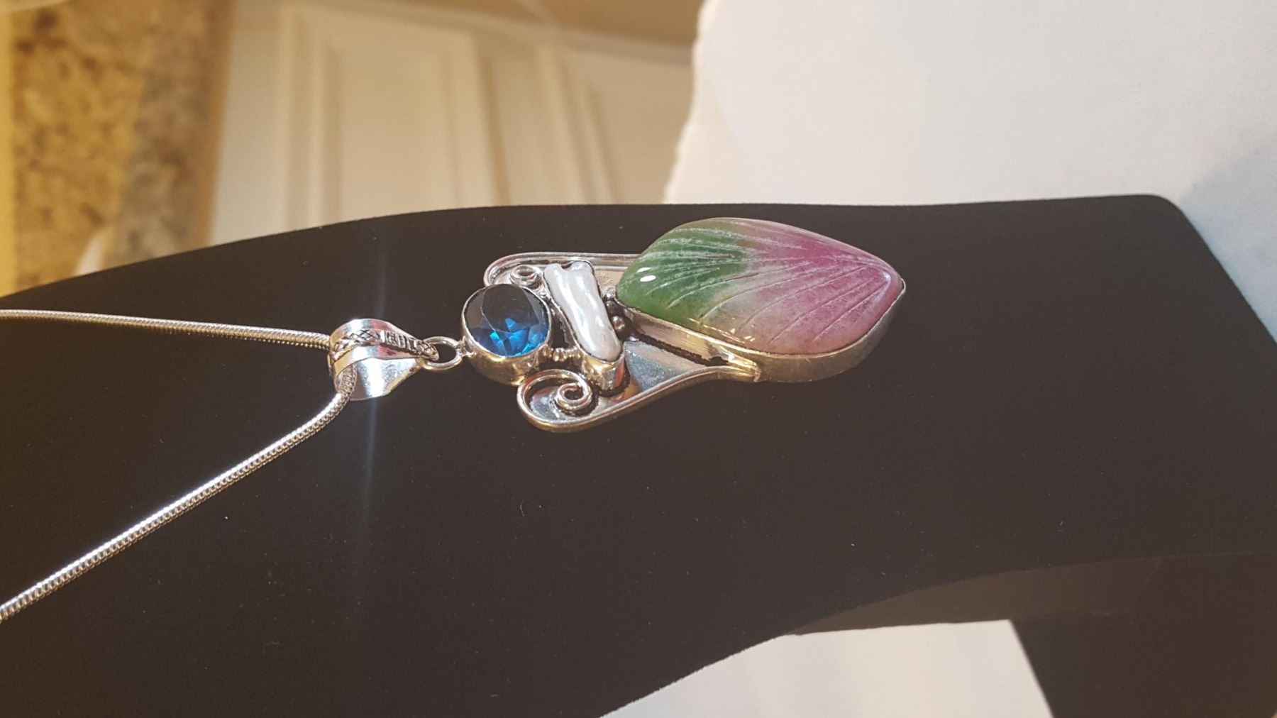 BEAUTIFUL HAND CARVED MULTI COLOR QUARTZ LEAF PENDANT. MOUNTED IN .925 STERLING SILVER.20 " LONG . INCLUDES 20 CHAIN. 27.50 TOTAL GRAM WT. STUNNING