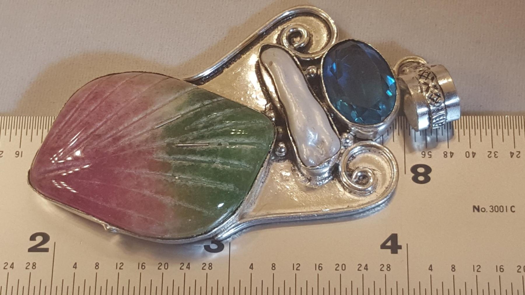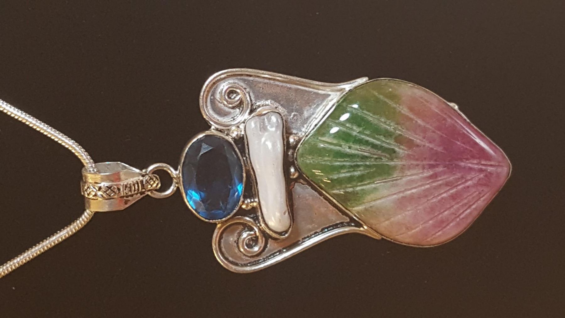 BEAUTIFUL HAND CARVED MULTI COLOR QUARTZ LEAF PENDANT. MOUNTED IN .925 STERLING SILVER.20 " LONG . INCLUDES 20 CHAIN. 27.50 TOTAL GRAM WT. STUNNING