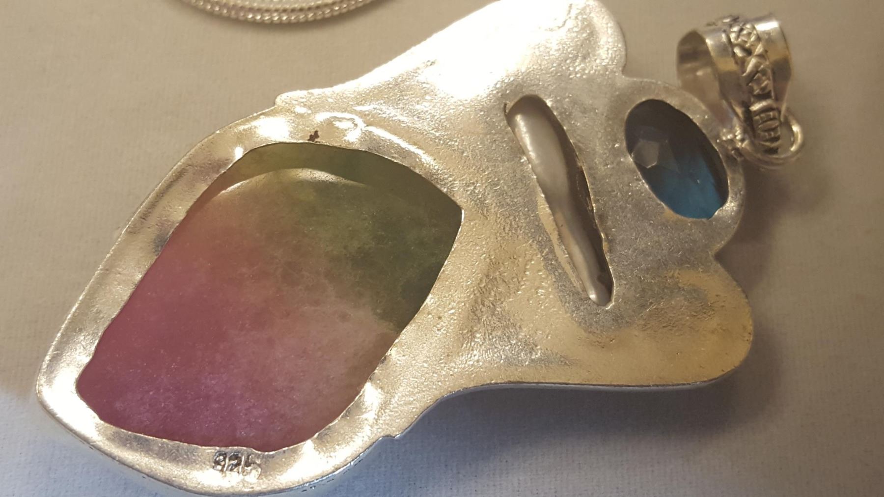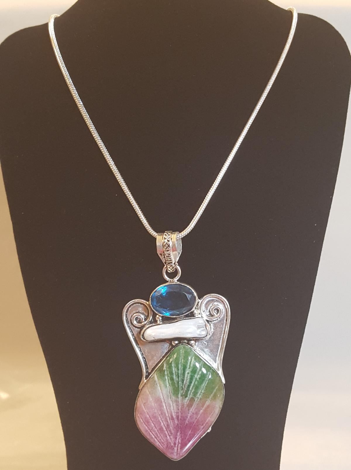 BEAUTIFUL HAND CARVED MULTI COLOR QUARTZ LEAF PENDANT. MOUNTED IN .925 STERLING SILVER.20 " LONG . INCLUDES 20 CHAIN. 27.50 TOTAL GRAM WT. STUNNING