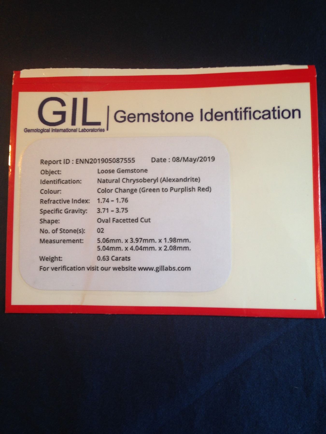 BEAUTIFUL PAIR OF NATURAL CERTIFIED ALEXANDRITES.FINE MATCHING PAIR. ONLY 100'S OF A mm. DIFFERENCE. THE GEMOLIGIST COULD NOT CUT CLOSER TO NATCHING THAN THESE TWO. ONE OVAL CUT MEASURING 5.06 x 3.97 x 1.98 mm.. THE OTHER MEASURES 5.04 x 4.04 x 2.08. PERFECT FOR EARRINGS. THESE COLOR CHANGE ALEXANDRITES CHANGE FRON A GREENISH GRAY TO PINKISH GOLD AND PURPLISH COLOR. PLEASE ENJOY THE VIDEOS. THIS PAIR OF ALEXANDRITES ARE 100 % NATURAL AND UNTREATED. THEY COME WITH A GIL CERTIFICATION AS WELL.