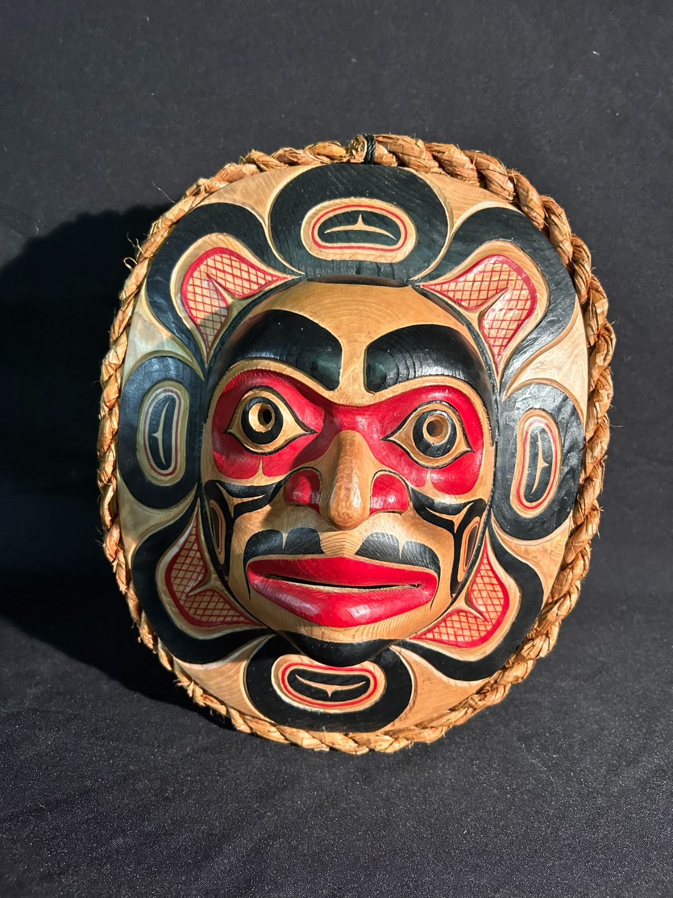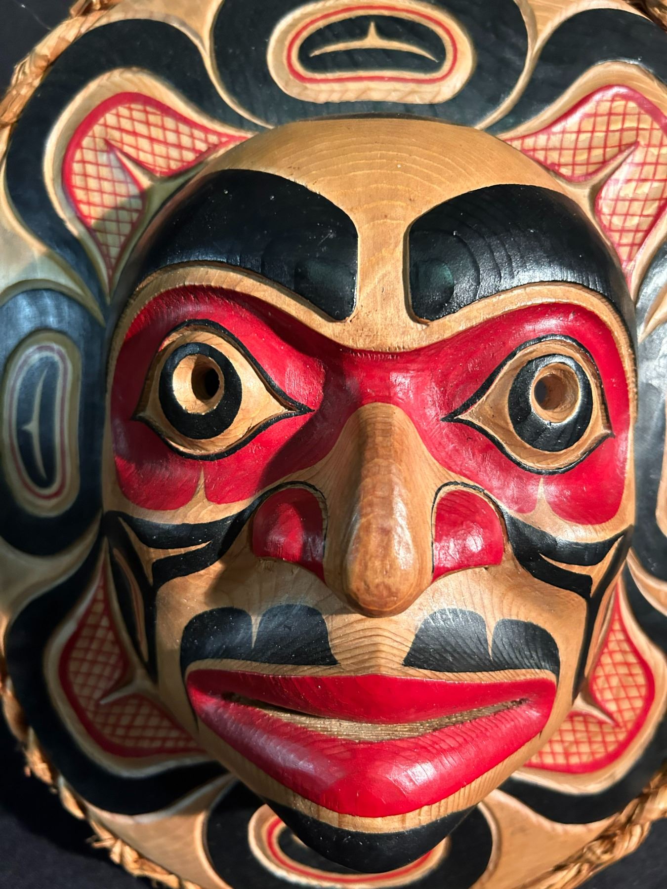 BEAUTIFULLY CARVED AND PAINTED MOON MASK BY XUUJ STAANG (BEAR PAW) MASK MEASURES 13" X 11"