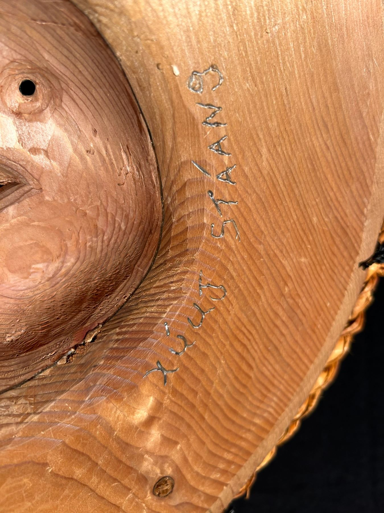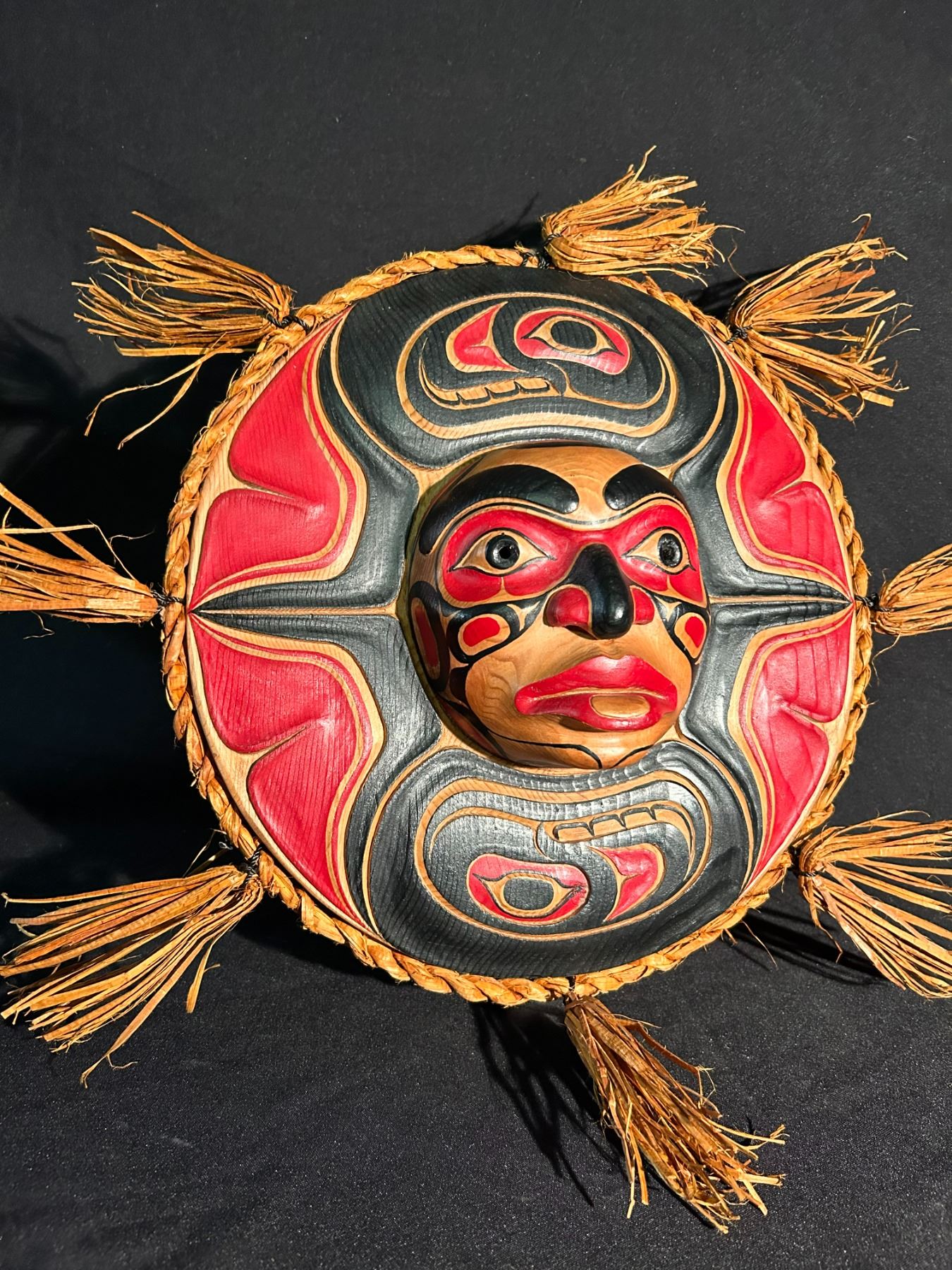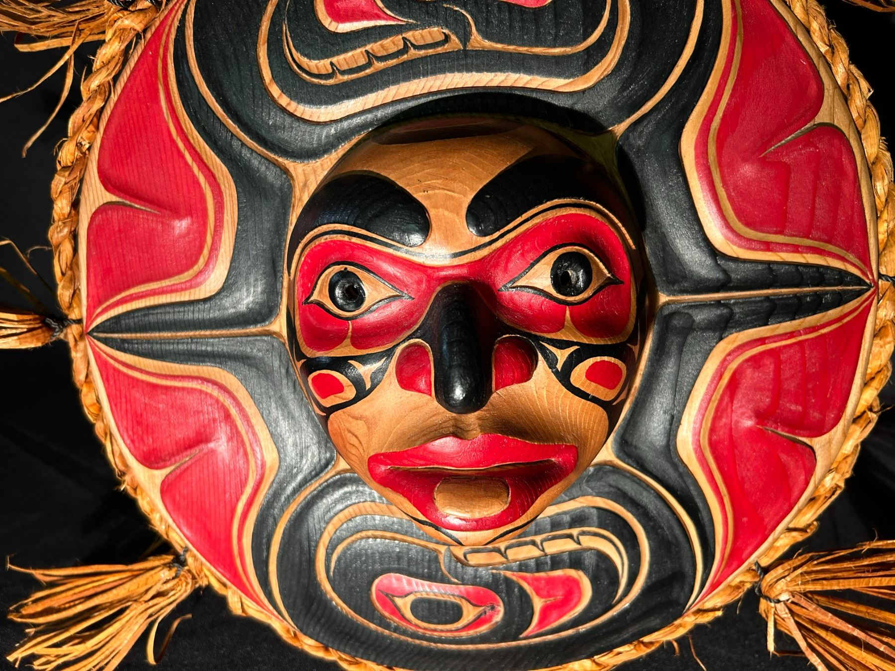 BEAUTIFULLY CARVED AND PAINTED MOON MASK BY XUUJ STAANG (BEAR PAW) MASK MEASURES 12.5" X 12.5"