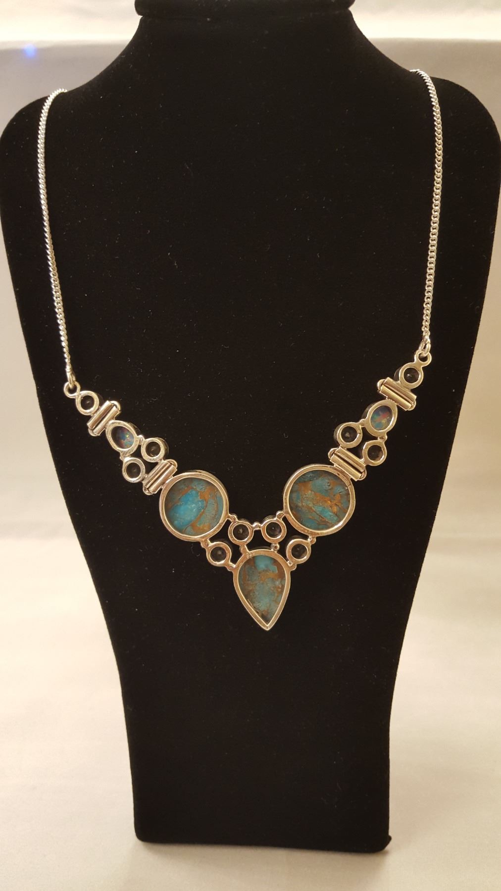 BEAUTUFUL 25 CT NATURAL ARIZONA BLUE TURQUOISE AND COPPER ACCENT NECKLACE. INCLUDES 10 SKY BLUE TOPAZ HIGHLIGHT STONES ALONG WITH 2 BRILLIANT FIRE OPALS. MOUNTED IN SOLID .925 STERLING SILVER. 19" LONG .925 STERLING SILVER CHAIN.110 CTTW OR 22 GRAM TOTAL WEIGHT. GET READY FOR THE COMPLIMENTS ON THIS ONE