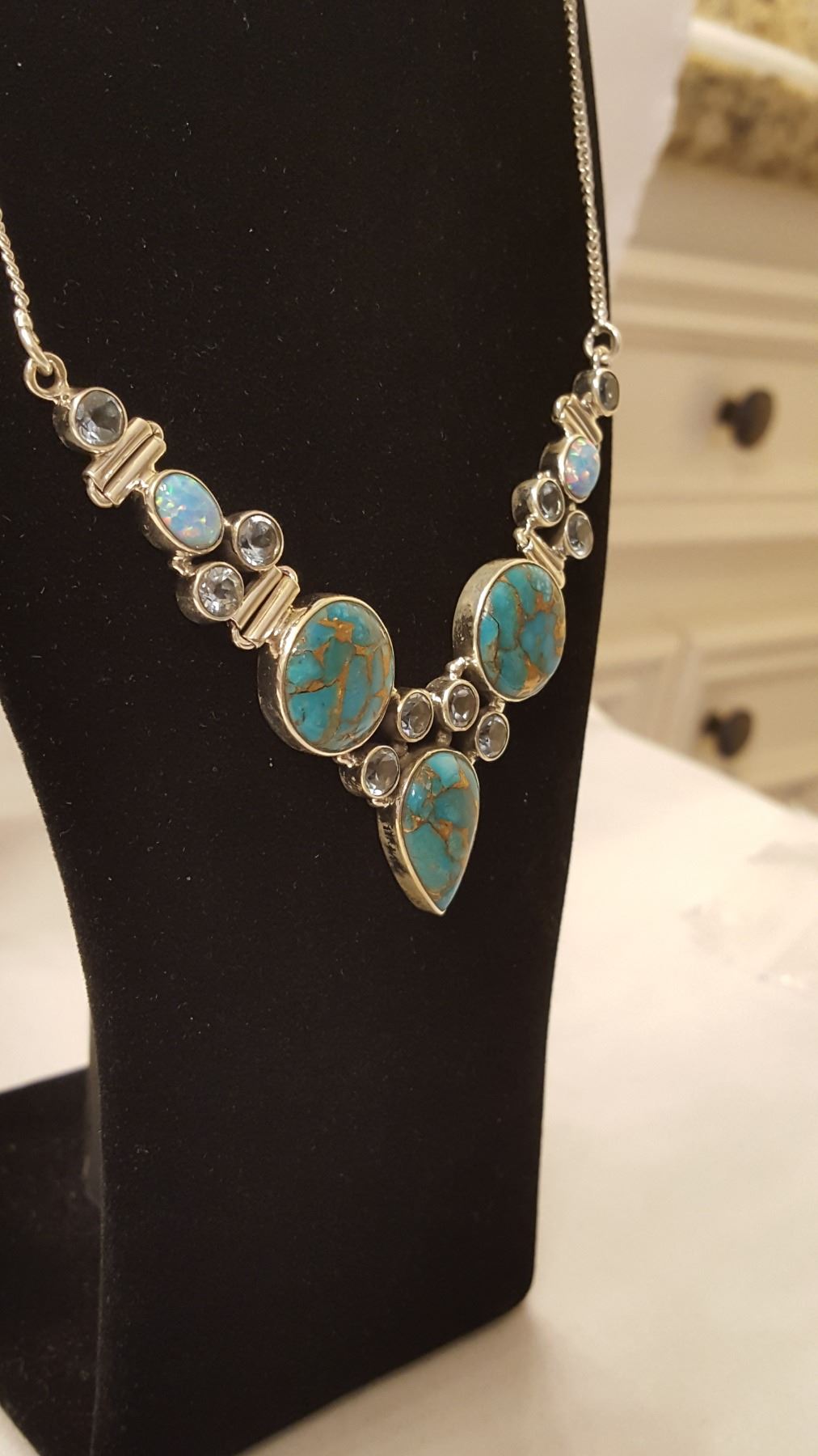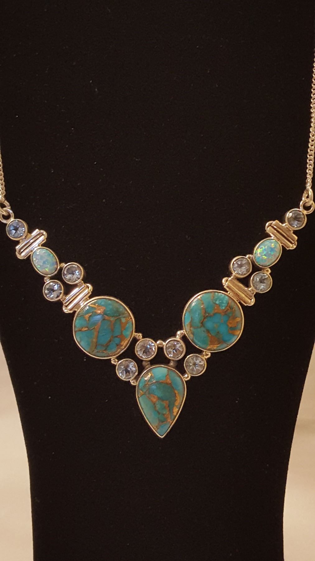 BEAUTUFUL 25 CT NATURAL ARIZONA BLUE TURQUOISE AND COPPER ACCENT NECKLACE. INCLUDES 10 SKY BLUE TOPAZ HIGHLIGHT STONES ALONG WITH 2 BRILLIANT FIRE OPALS. MOUNTED IN SOLID .925 STERLING SILVER. 19" LONG .925 STERLING SILVER CHAIN.110 CTTW OR 22 GRAM TOTAL WEIGHT. GET READY FOR THE COMPLIMENTS ON THIS ONE