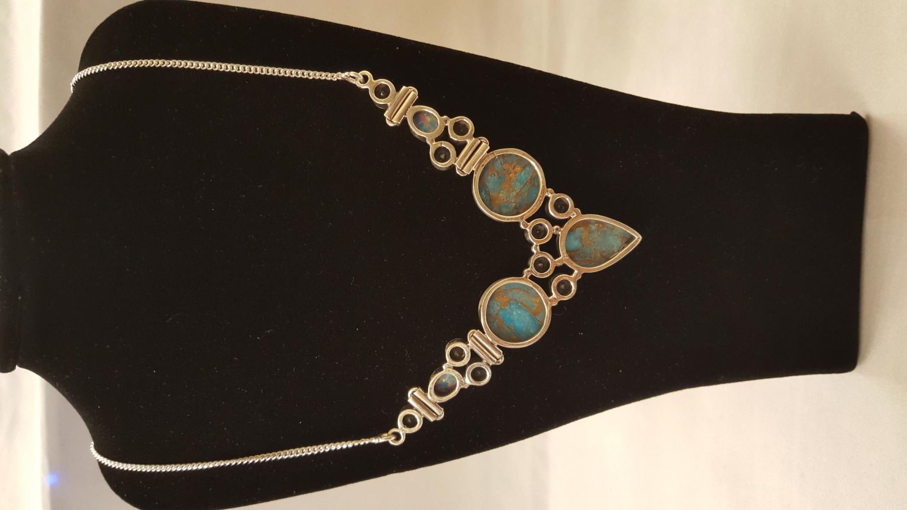 BEAUTUFUL 25 CT NATURAL ARIZONA BLUE TURQUOISE AND COPPER ACCENT NECKLACE. INCLUDES 10 SKY BLUE TOPAZ HIGHLIGHT STONES ALONG WITH 2 BRILLIANT FIRE OPALS. MOUNTED IN SOLID .925 STERLING SILVER. 19" LONG .925 STERLING SILVER CHAIN.110 CTTW OR 22 GRAM TOTAL WEIGHT. GET READY FOR THE COMPLIMENTS ON THIS ONE