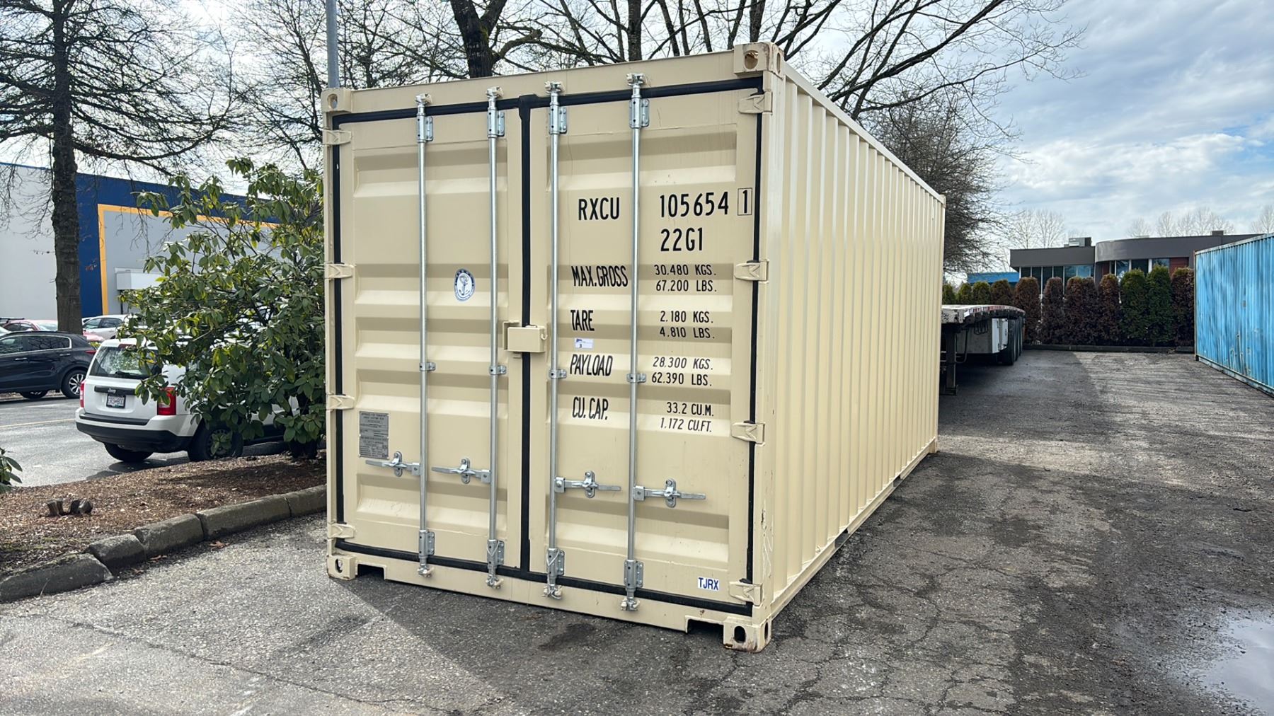 BEIGE 20' 67,200 MAX CAPACITY INDUSTRIAL TRANSPORT CONTAINER WITH DUAL SWING REAR DOORS WITH CAM LOCKS, 20'L X 96"W X 101"H - RXCU 105654 1 *REQUIRES HIAB/CRANE OR *REQUIRES HIAB/CRANE OR TILT DECK TRAILER TO TRANSPORT/LAST DAY REMOVAL SUN APRIL 13TH*