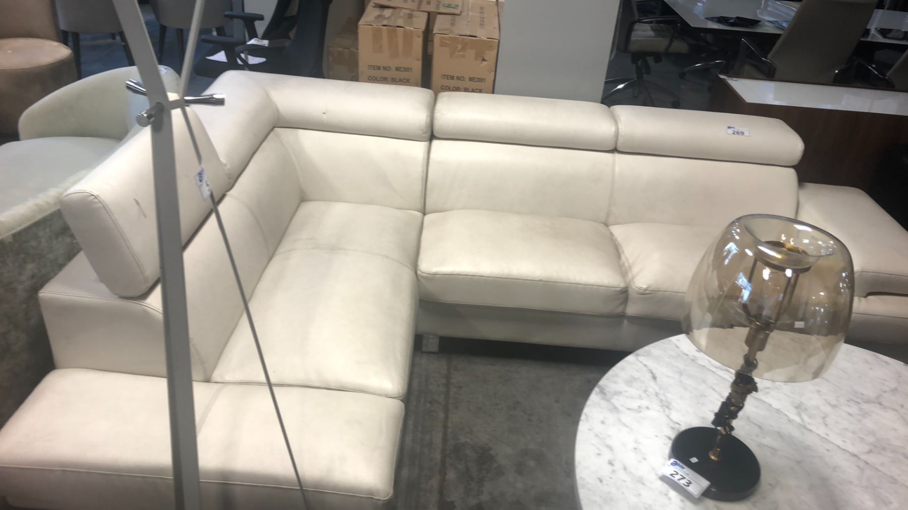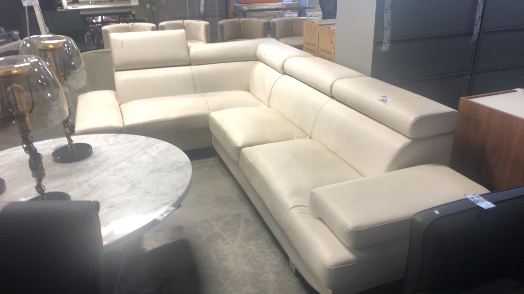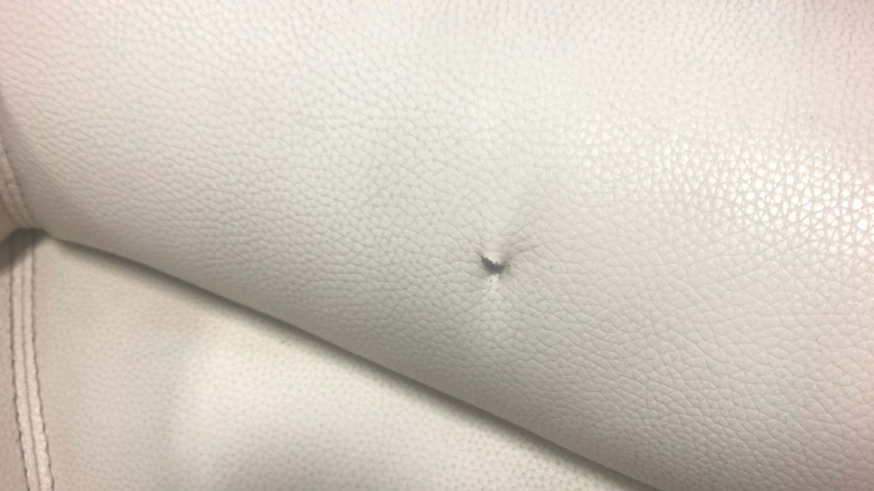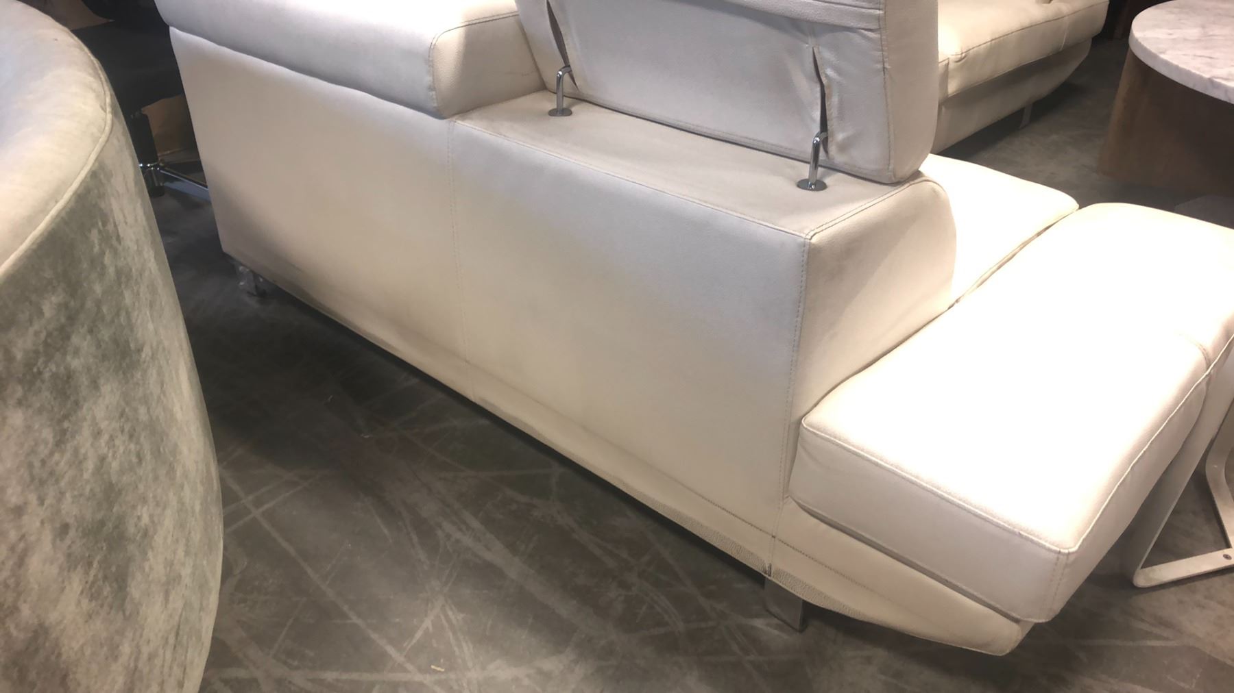 BEIGE GRAIN FAUX LEATHER SOFA D76" X W115" X H36" - MINOR TEAR, NEEDS CLEANING
