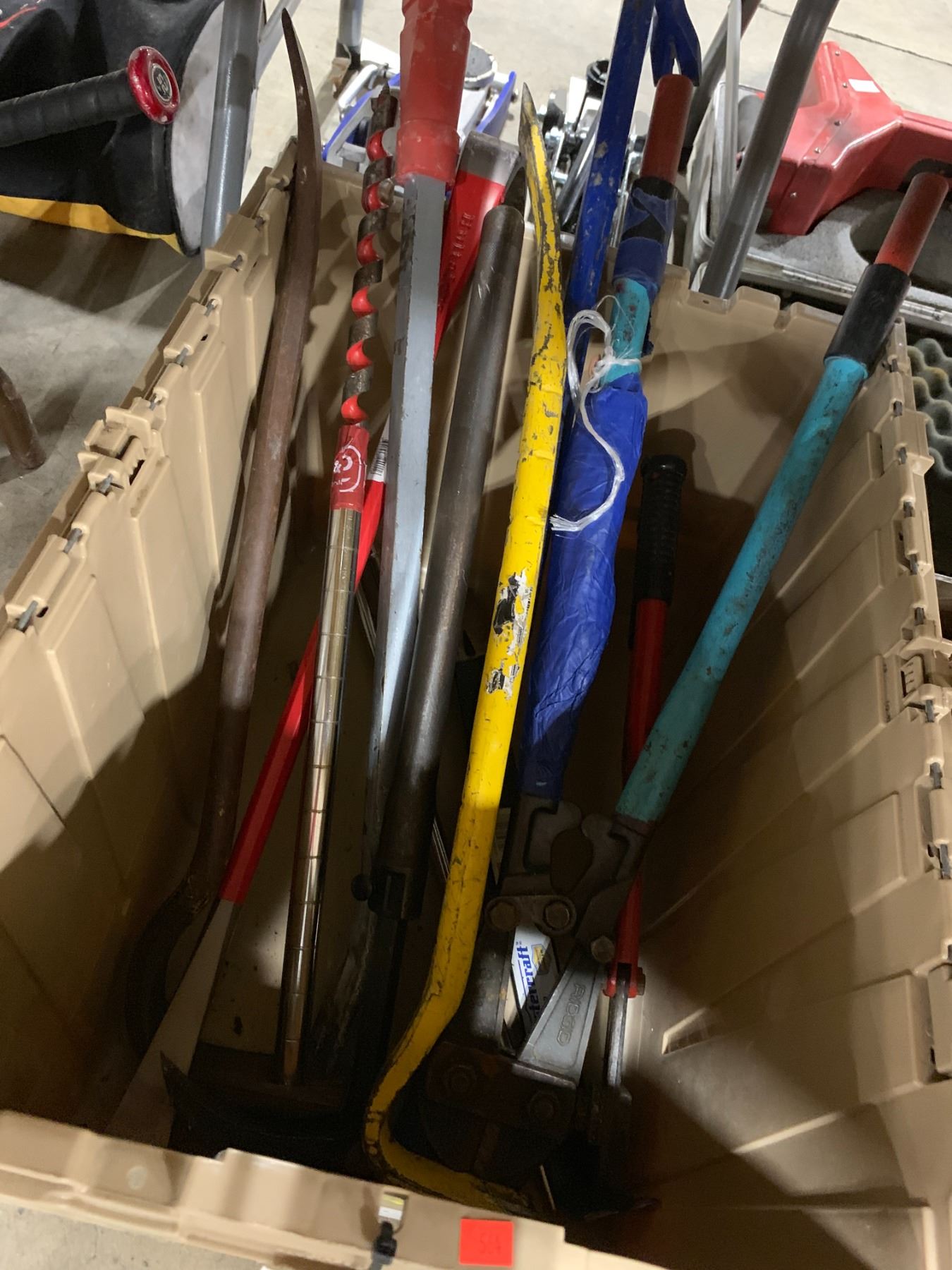 BEIGE PLASTIC BIN OF ASSORTED LARGE HAND TOOLS