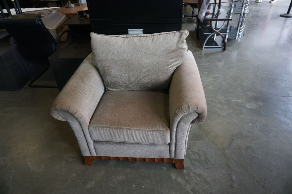 BEIGE UPHOLSTERED PILLOWBACK ARMCHAIR WITH WOOD BASE