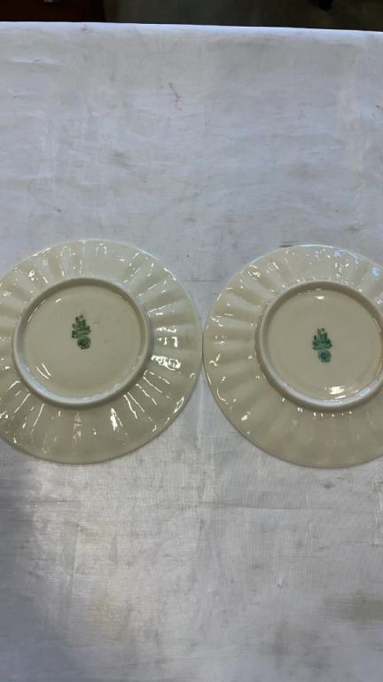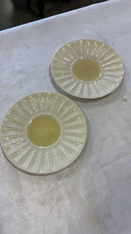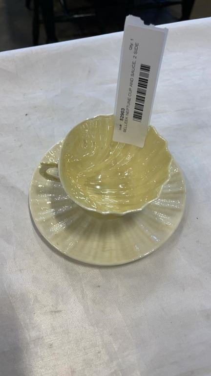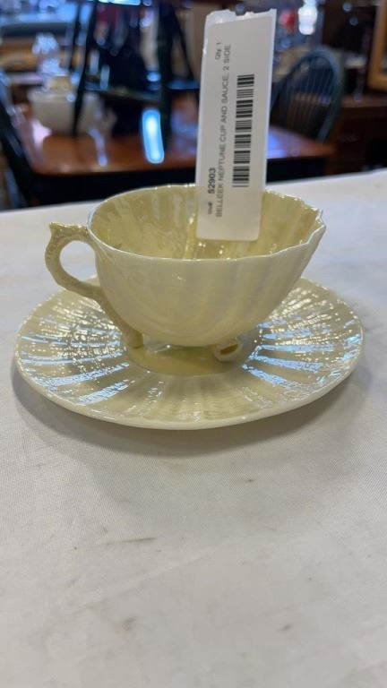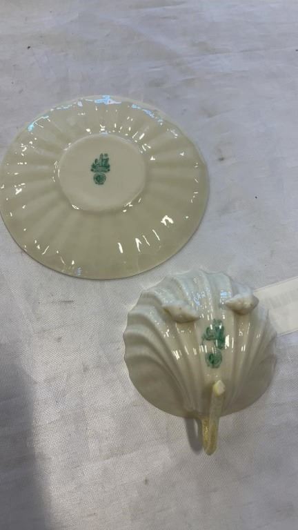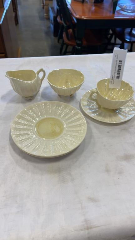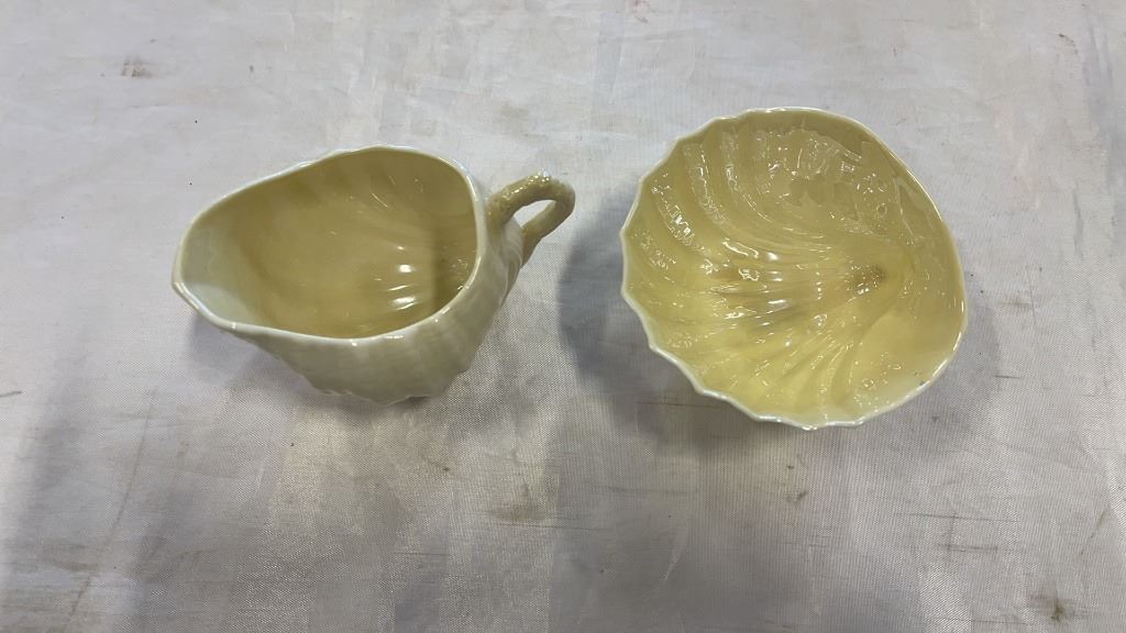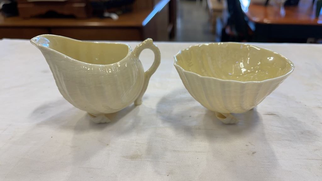 BELLEEK IRELAND CHINA NEPTUNE CUP AND SAUCE, 2 SIDE PLATES, AND CREAM AND SUGAR