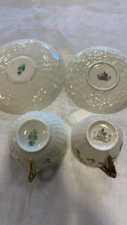 BELLEEK IRELAND CHINA SHAMROCK BASKETWEAVE TEAPOT W/ LID, AND 2 CUPS AND SAUCERS