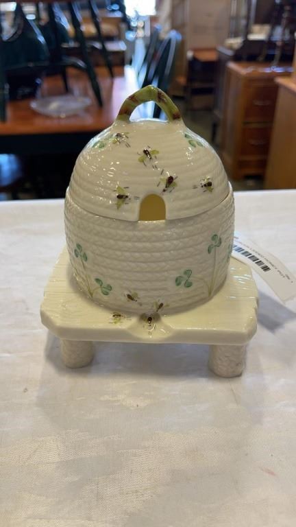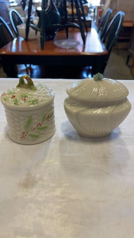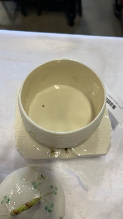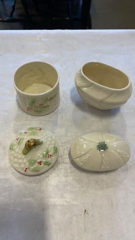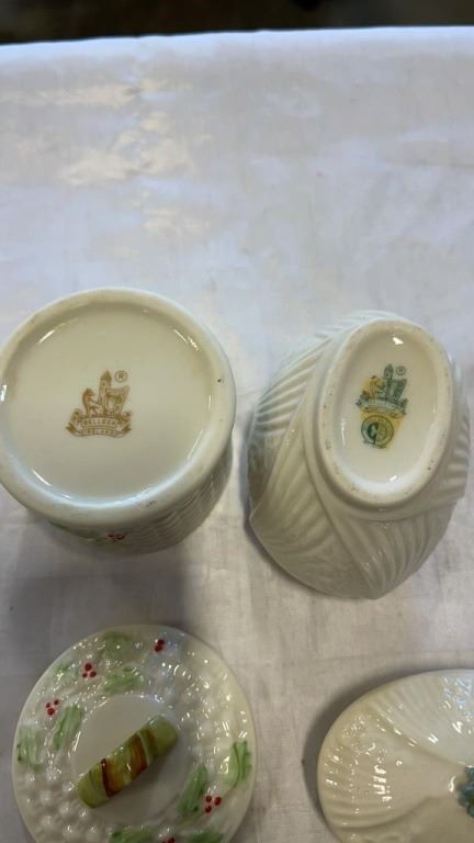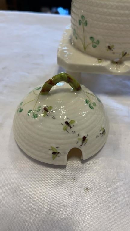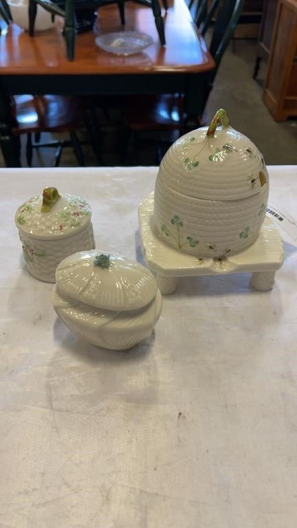 BELLEEK IRELAND CHINA SHAMROCK LIDDED HONEY POT AND 2 LIDDED DISHES