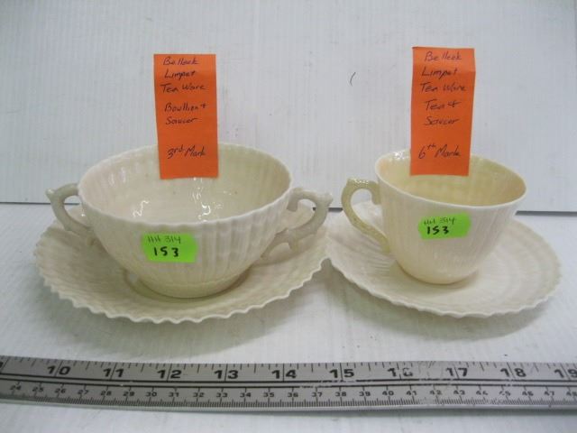 BELLEEK LIMPET TEAWARE BOUILLON & SAUCER, 3RD MARK & A TEACUP & SAUCER, 6TH MARK