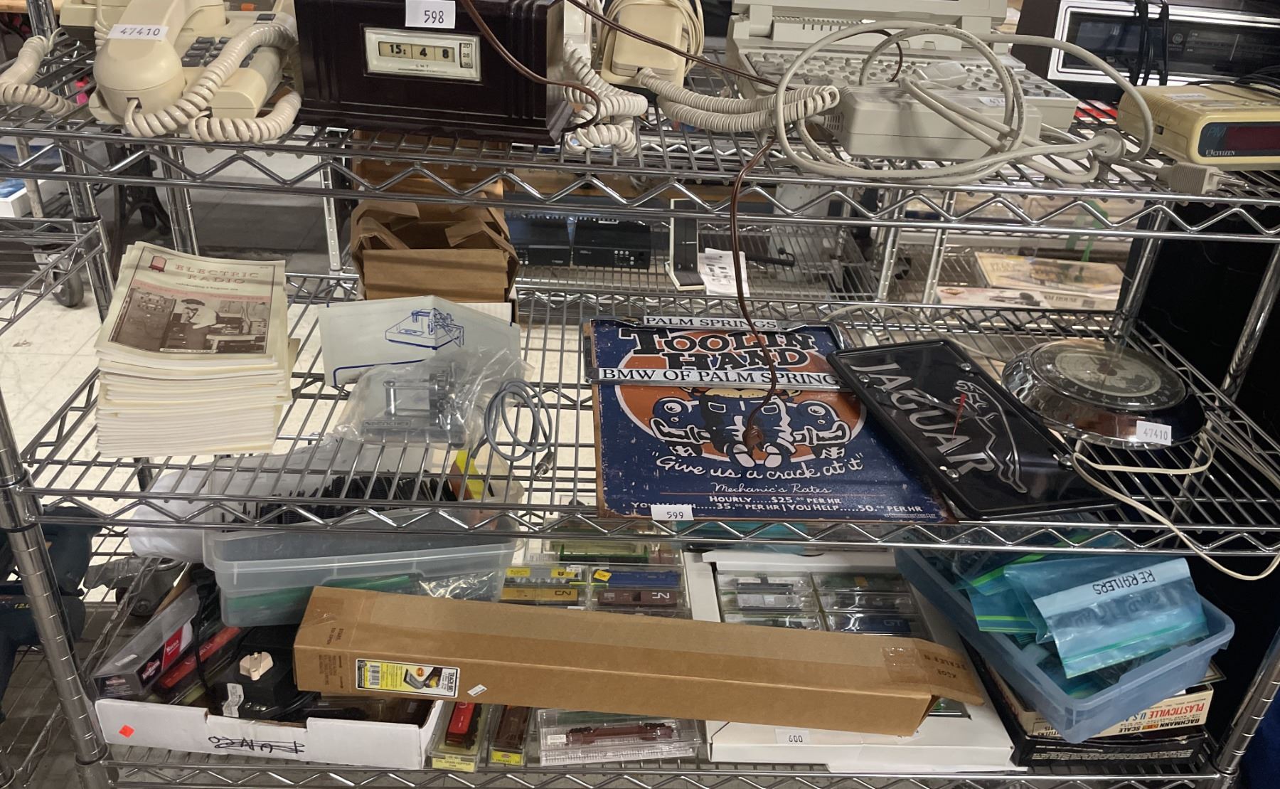 BENCHER PADDLE, ELECTRIC RADIO PAMPHLETS, LICENSE PLATE COVER, WALL SIGN & TWO CLOCKS