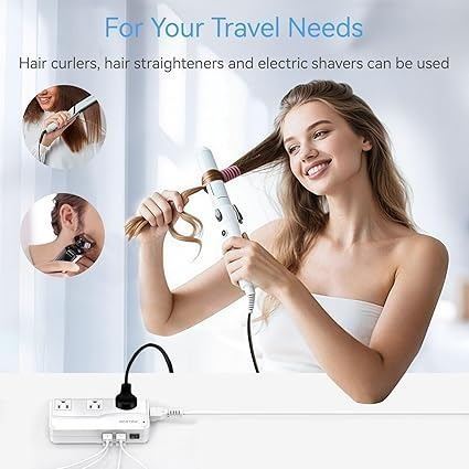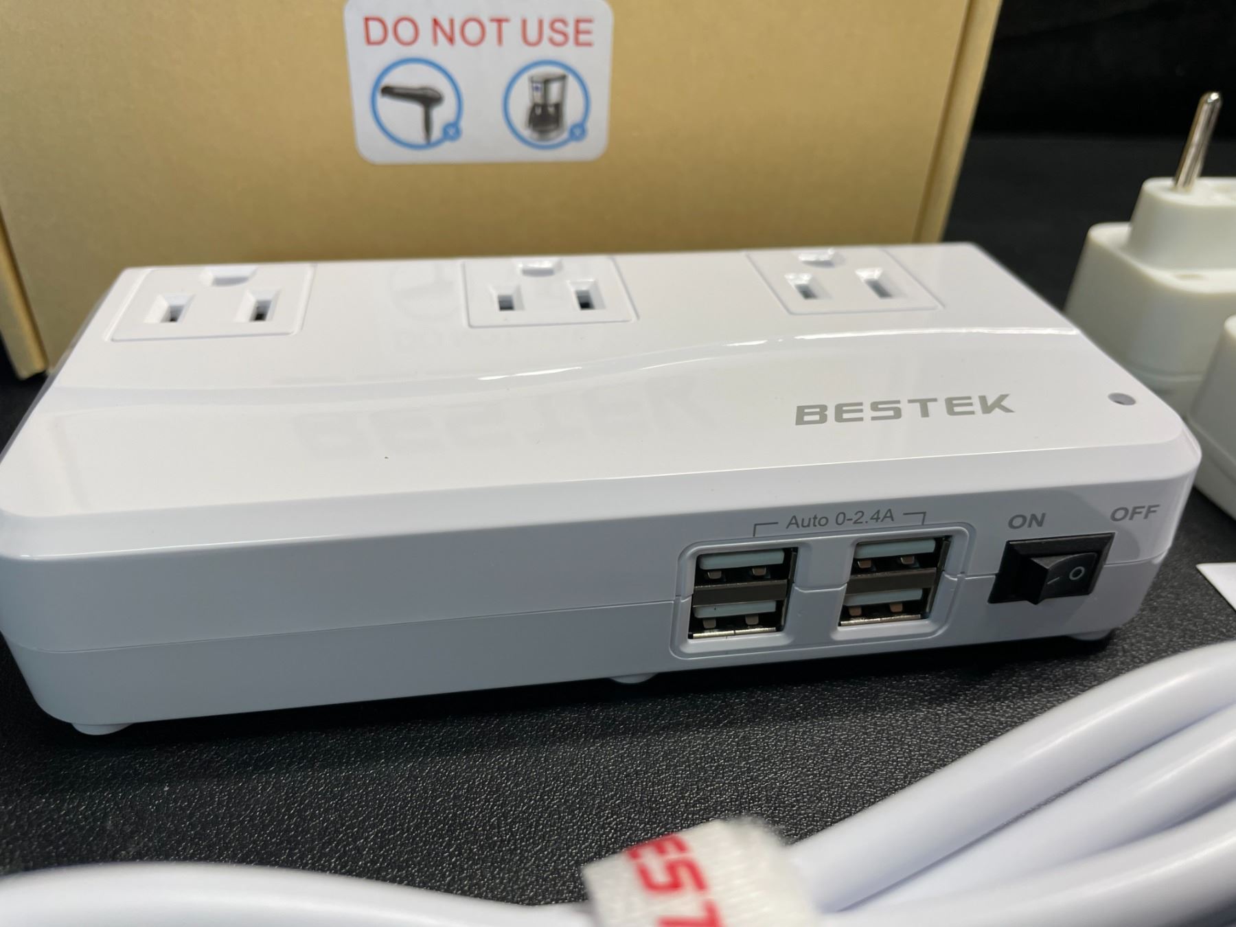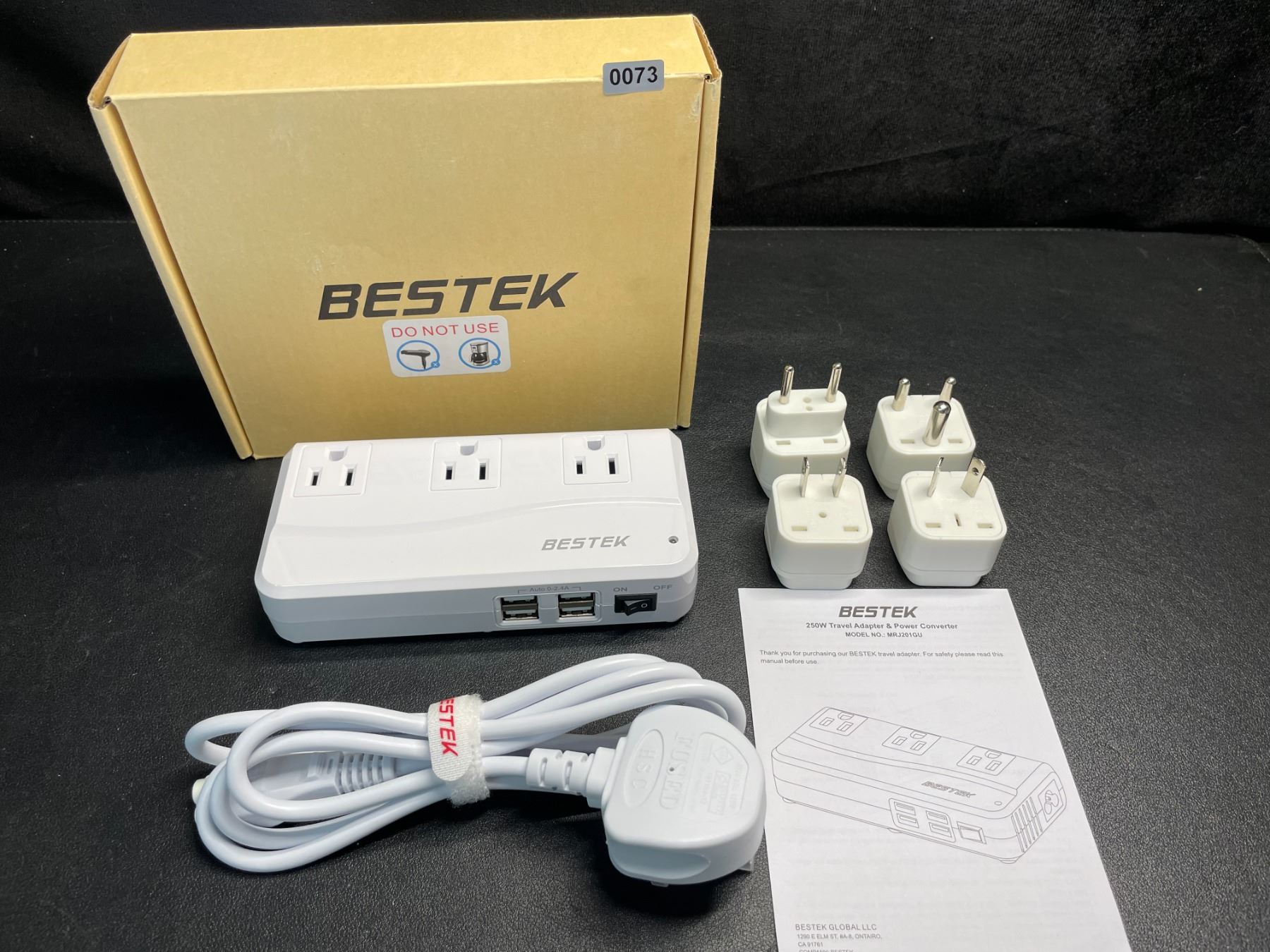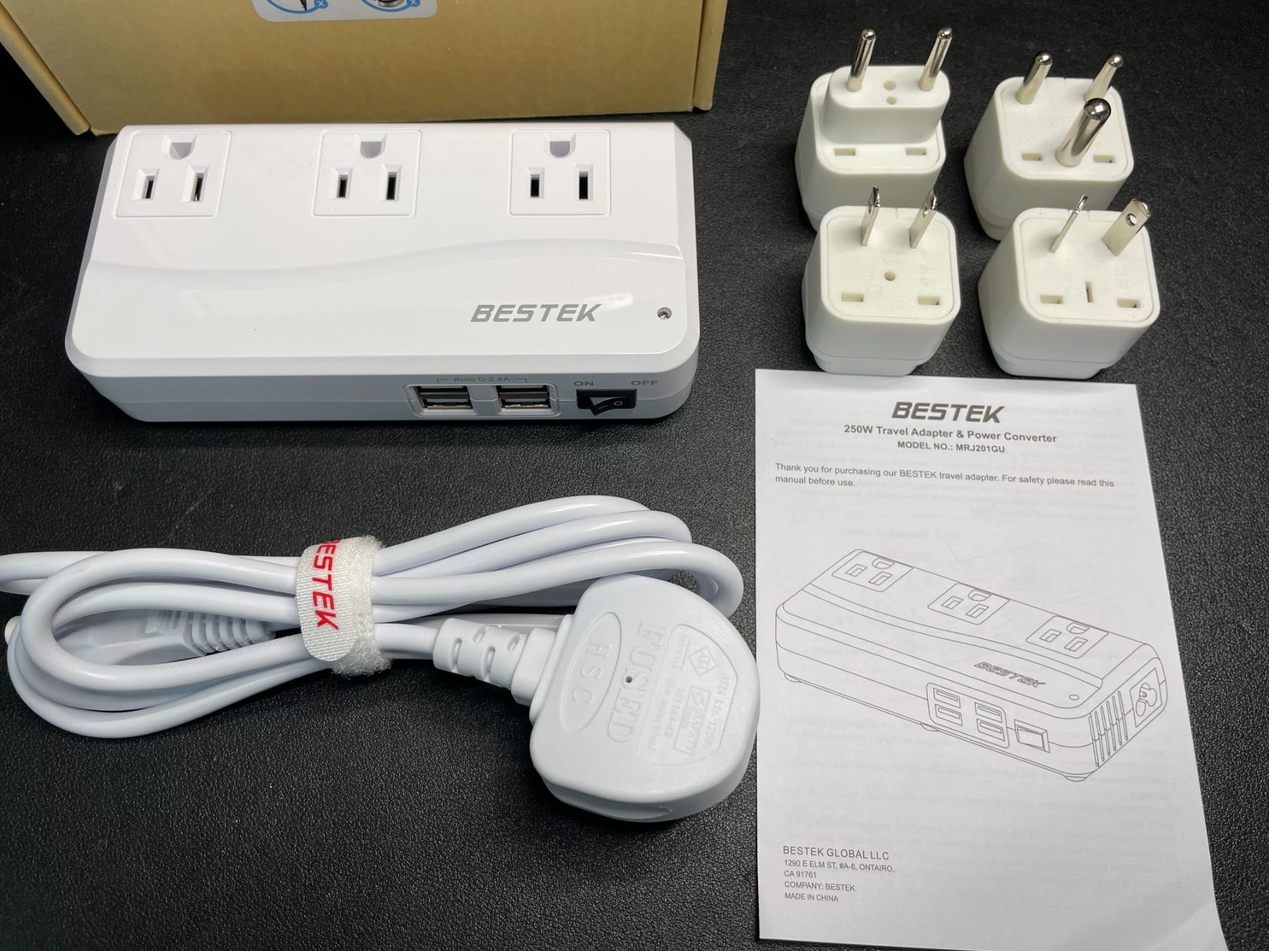 - BESTEK Travel Adapter with UK Plug Universal 100-220V to 110V Voltage Converter 250W with 6A 4-Port USB Charging 3 AC Sockets and EU/US/India/AU Adapter for Worldwide use (White)