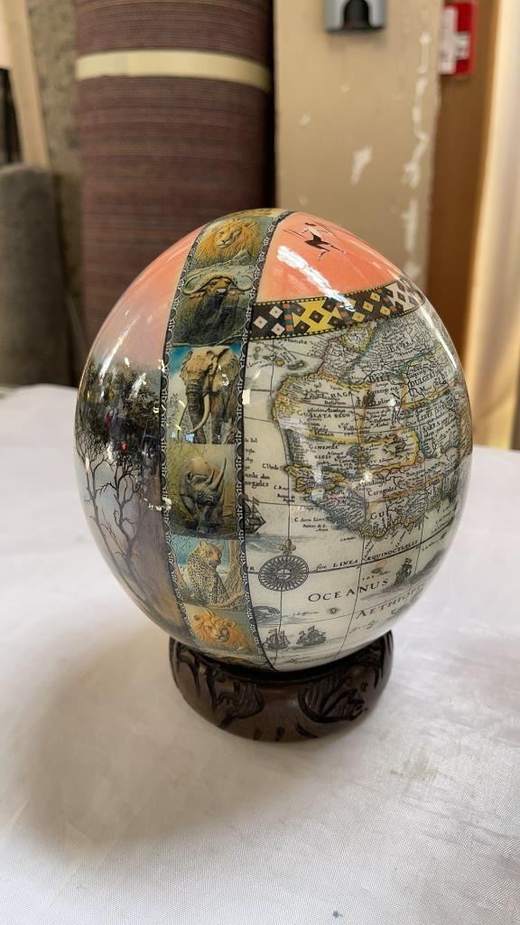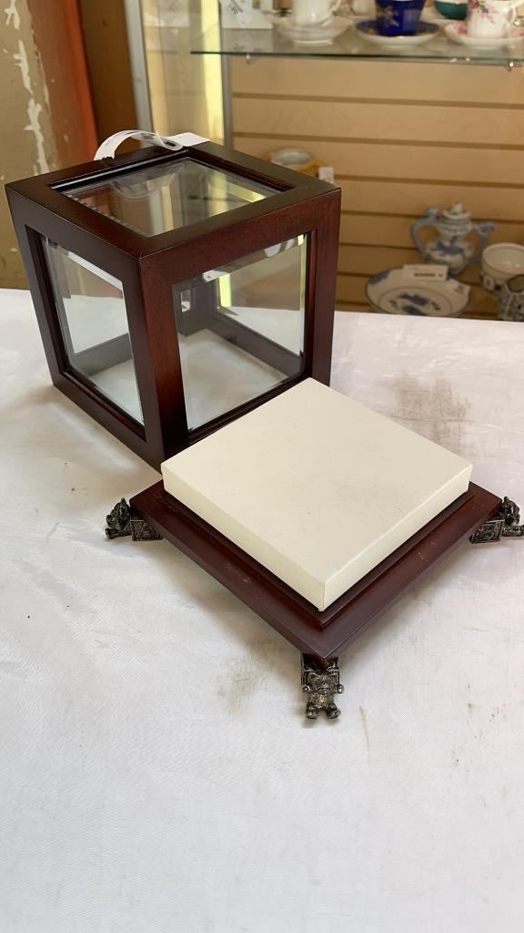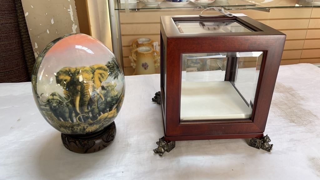BEVELLED GLASS DISPLAY CASE AND OSTRICH EGG ART