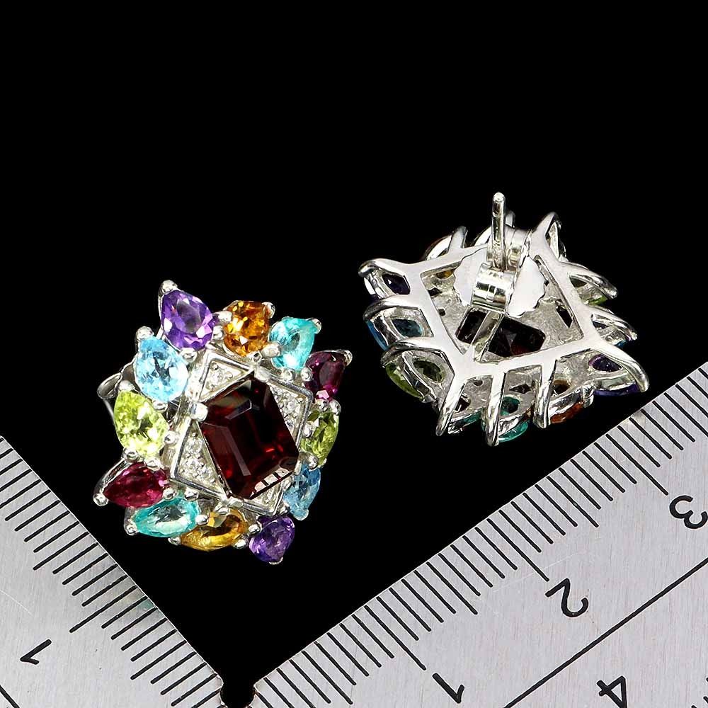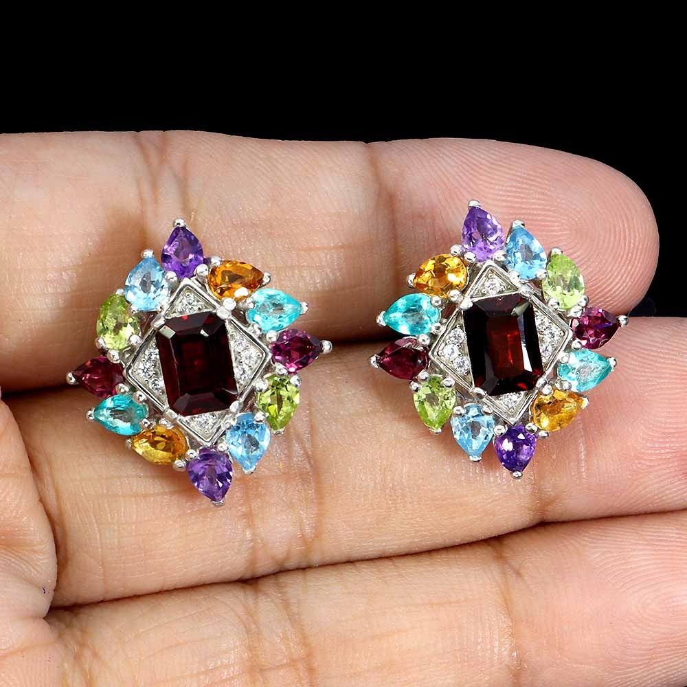 BIG MOZAMBIQUE GARNET, AMETHYST, CITRINE, PARAIBA BLUE TOPAZ, PERIDOT, SKY BLUE TOPAZ AND RHODOLITE GARNET EARRINGS IN 14K WHITE PLATED GOLD OVER 925 STERLING SILVER - APPRAISED REPLACEMENT VALUE