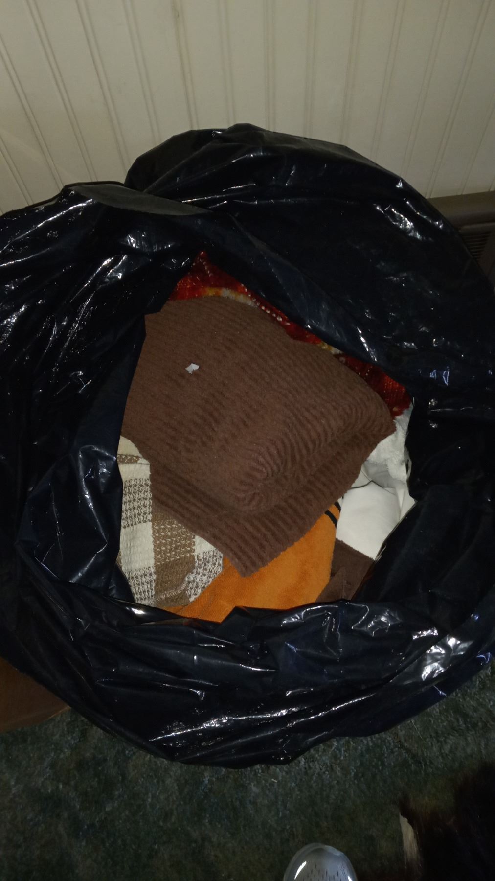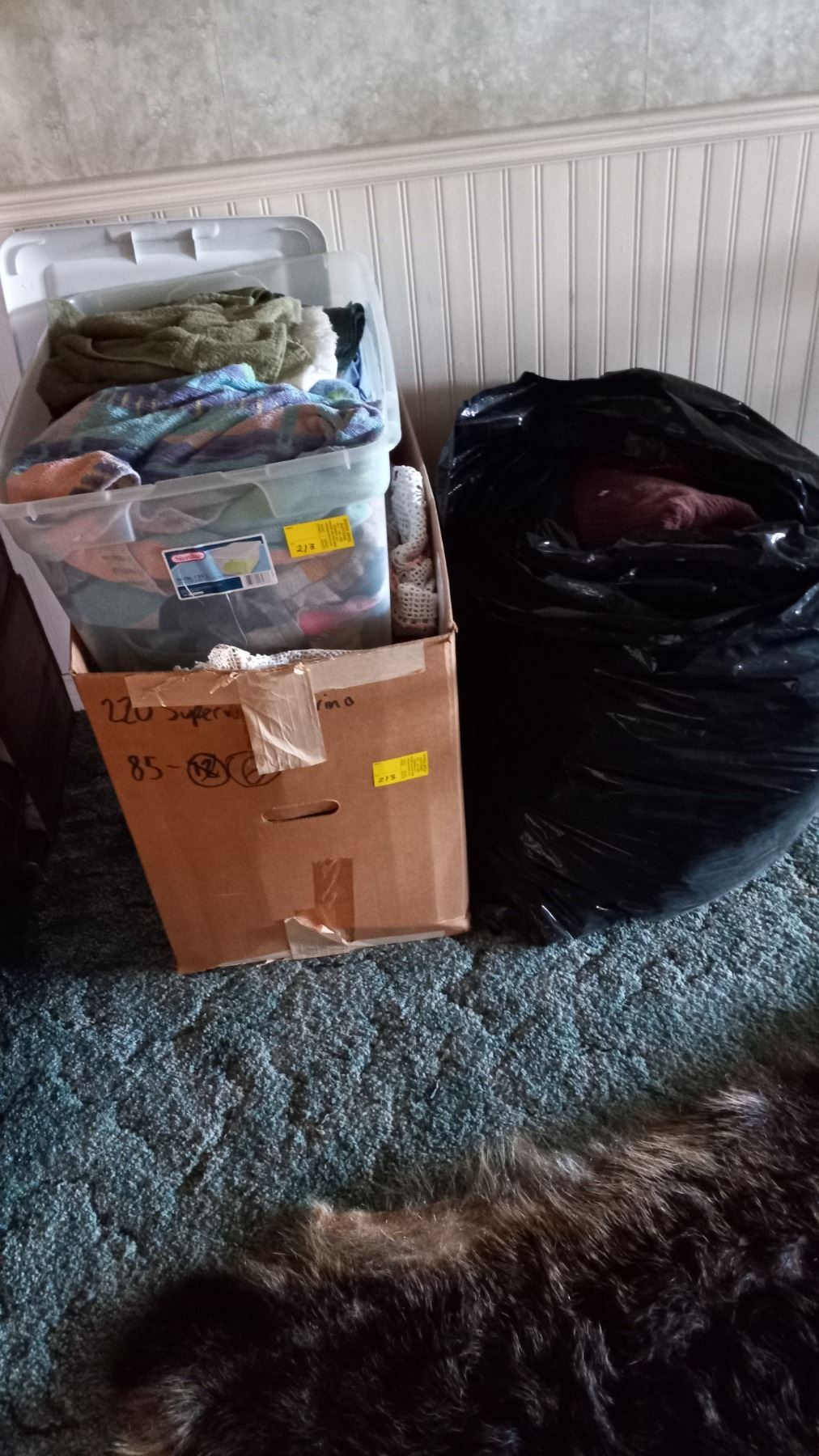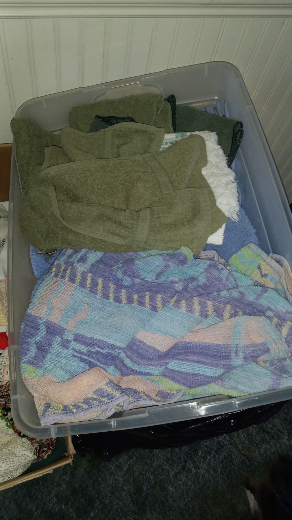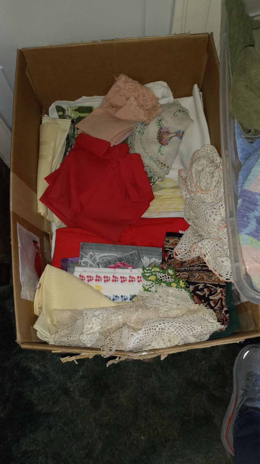 BIN, BOX & BAG OF MISC. TOWELS, SHEETS, DOILIES, ETC.