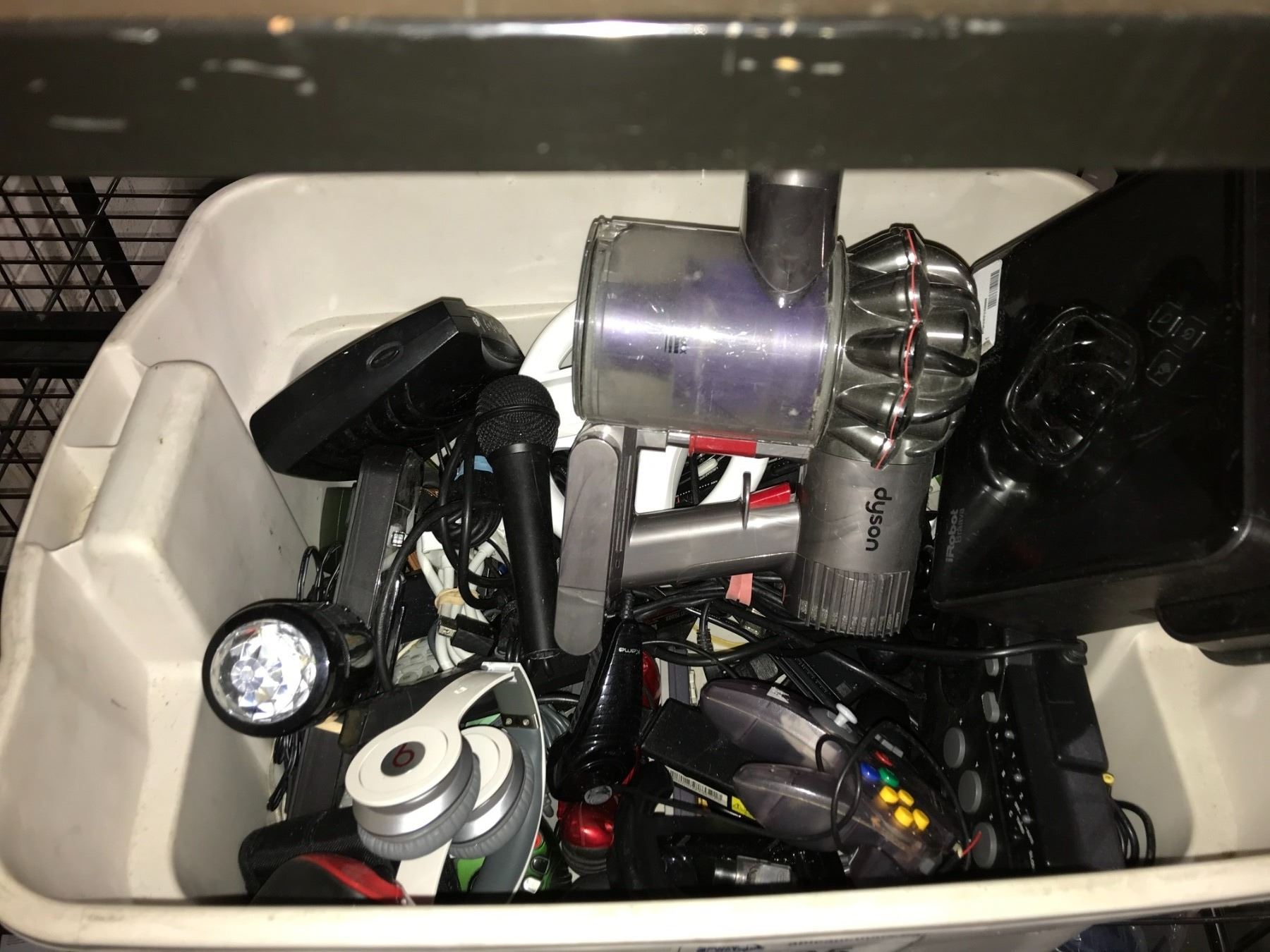 BIN OF ASSORTED DYSON PARTS AND ASSORTED ELECTRONICS