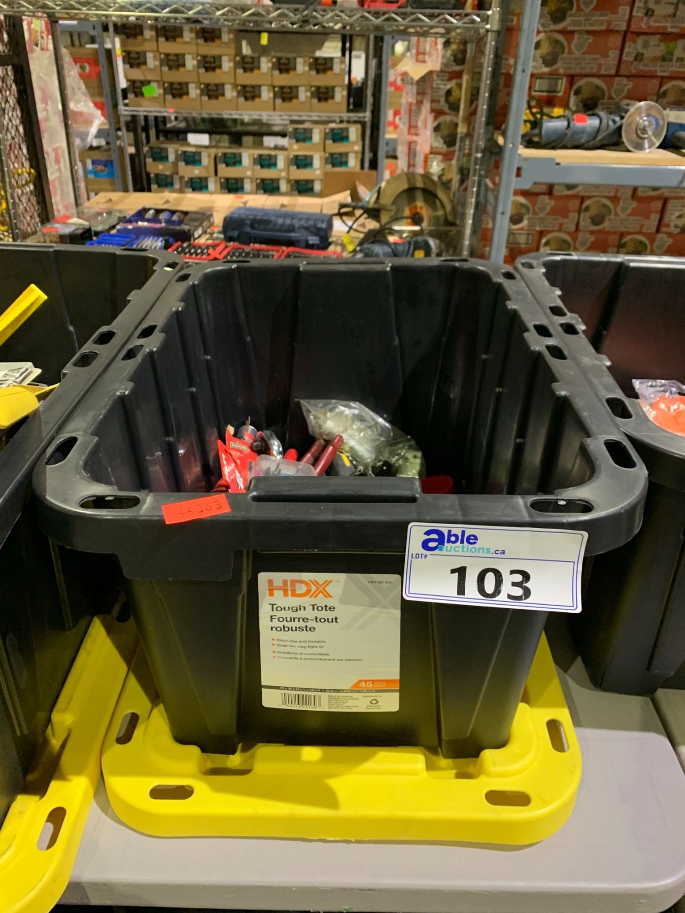 BIN OF ASSORTED ITEMS INCLUDING; SCREWDRIVER BIT SET, 1/2" DRIVE RATCHET, CRESCENT WRENCH & MORE