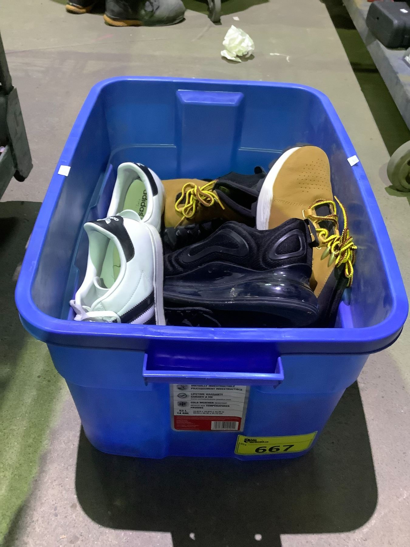 BIN OF ASSORTED SHOES INCLUDING; TIMBERLAND SIZE 9, ADIDAS SIZE 8-1/2, NIKE SIZE 9 & MORE