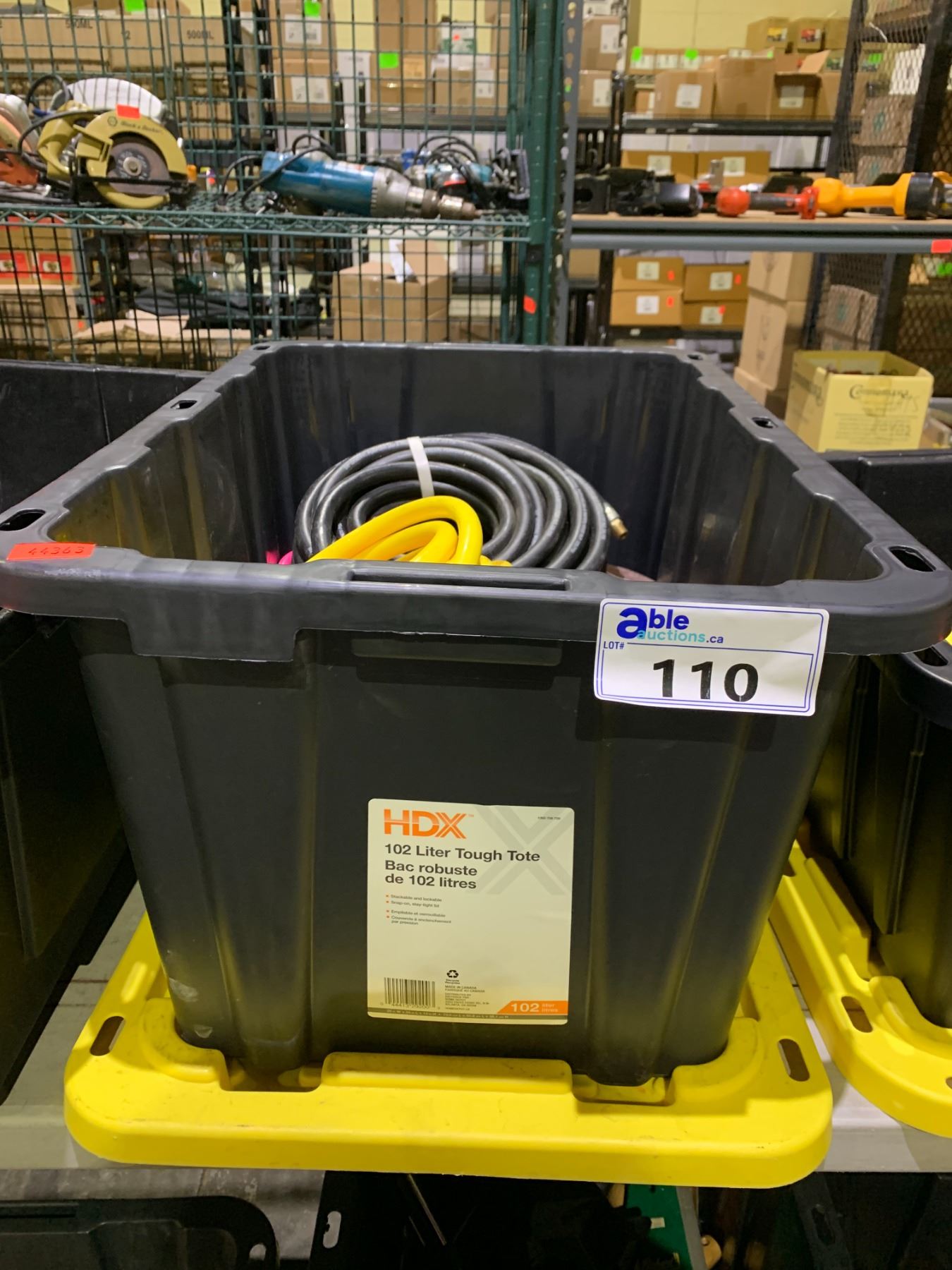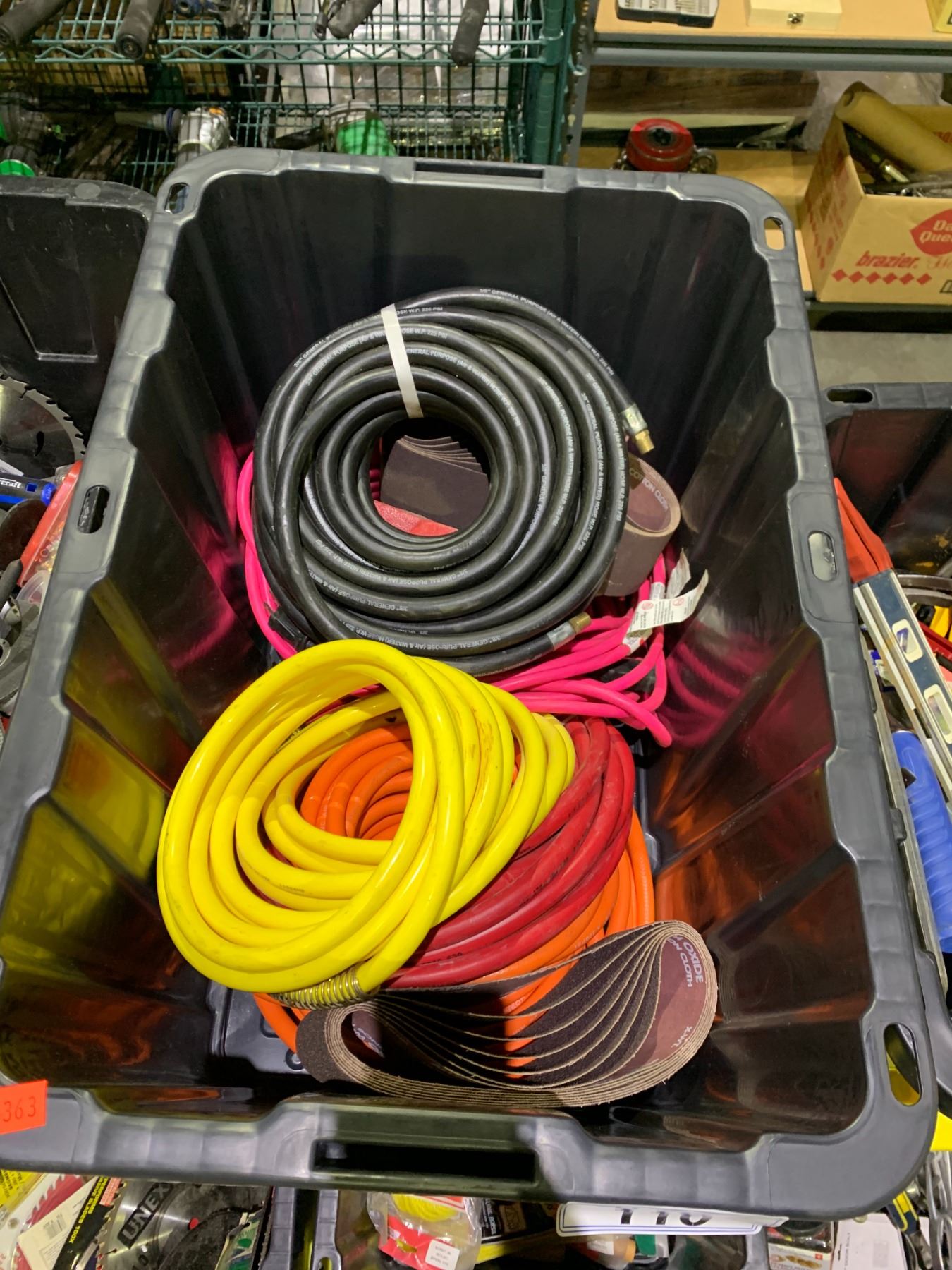 BIN OF ASSORTED TOOL RELATED ITEMS INCLUDING; VARIOUS LENGTHS OF AIR LINE, EXTENSION CORD & BELT SANDPAPER