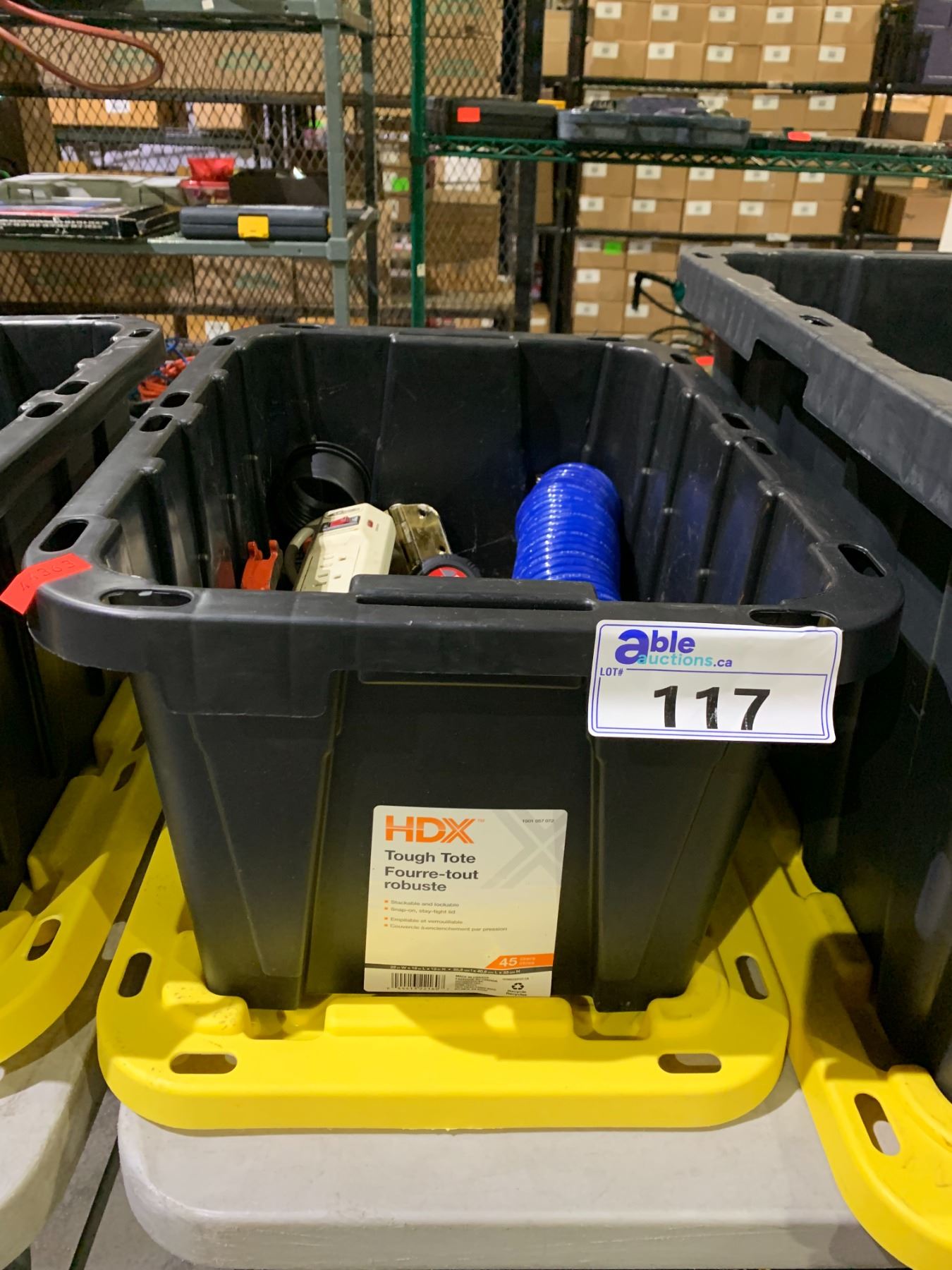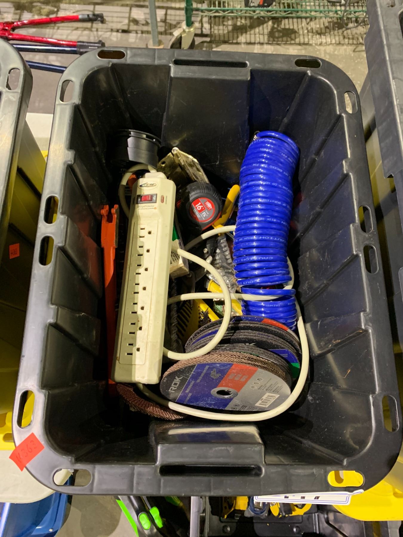 BIN OF ASSORTED TOOLS INCLUDING; CHAIN WRENCH, CUTTING WHEELS, AIR LINE & MORE