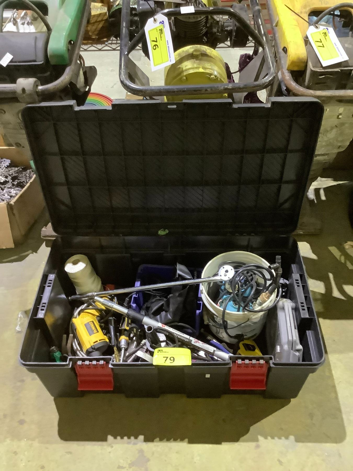 BIN OF ASSORTED TOOLS INCLUDING; DRILL, VARIOUS HAND TOOLS, PUMPS & MORE