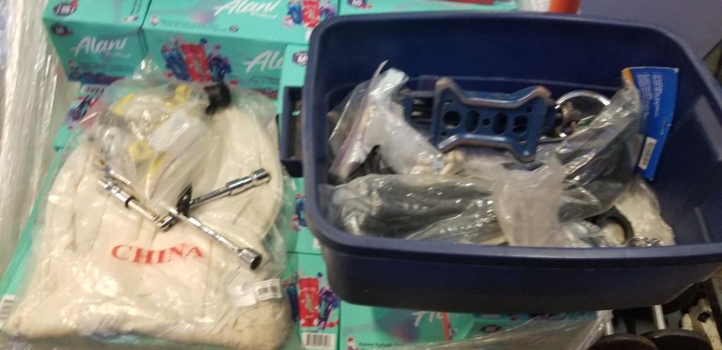 BIN OF AUTOMOTIVE ITEMS, FASTERS, TIRE COVER AND MORE