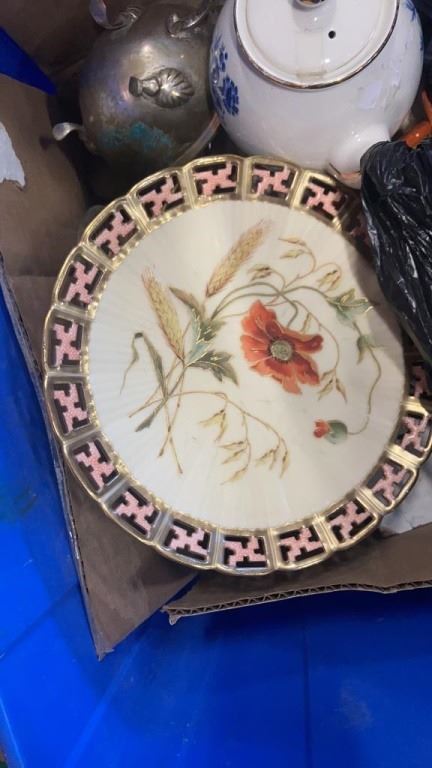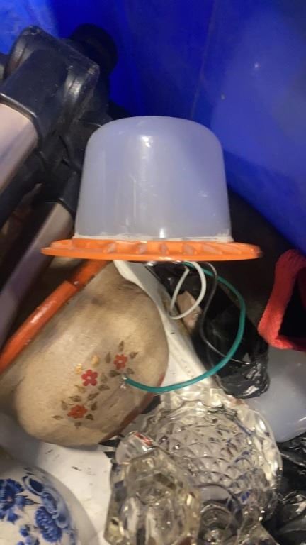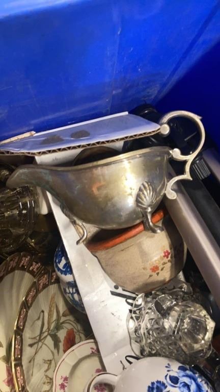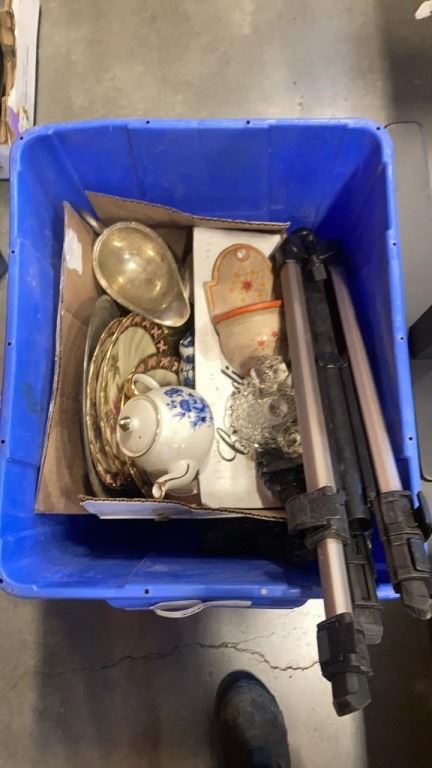 BIN OF ESTATE GOODS, GIBSON TEAPOT, CANDLES, GLASS FROG, DECORATIVE DISHES
