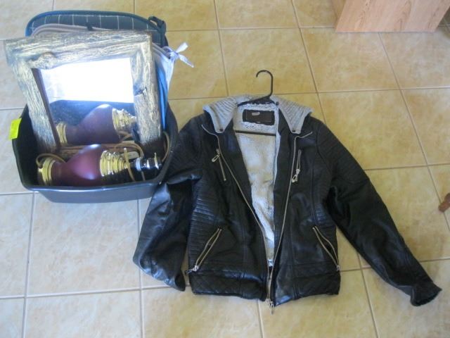 BIN OF MISC. LEATHER JACKET, MIRROR, CUSHIONS, ETC.