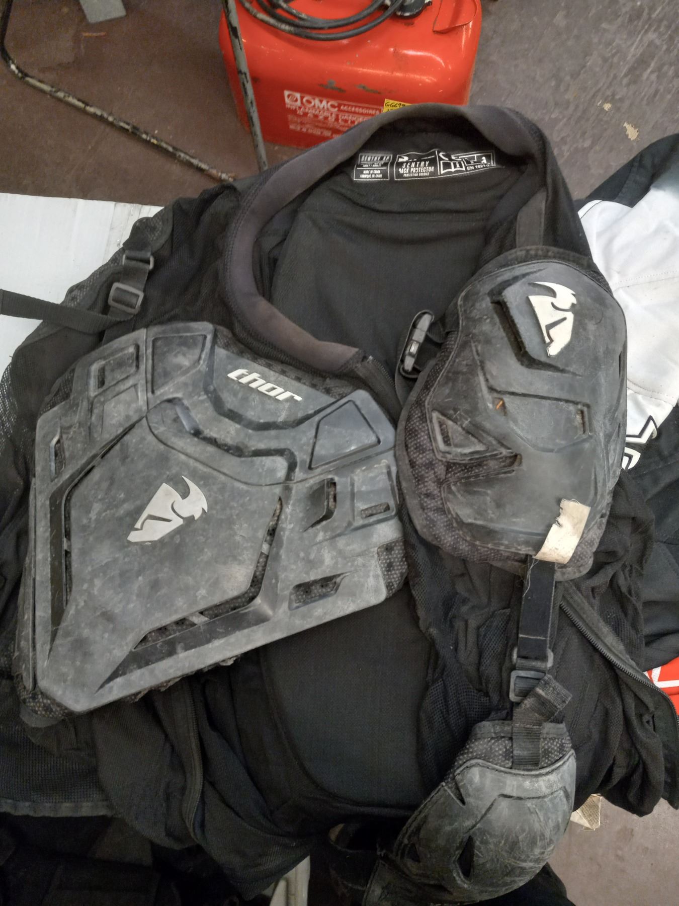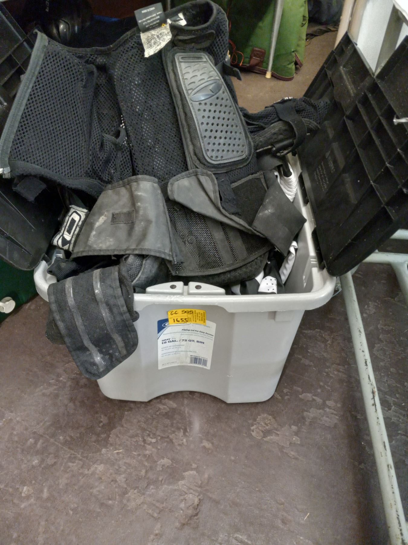 BIN OF MISC MOTOCROSS GEAR, PADS ETC