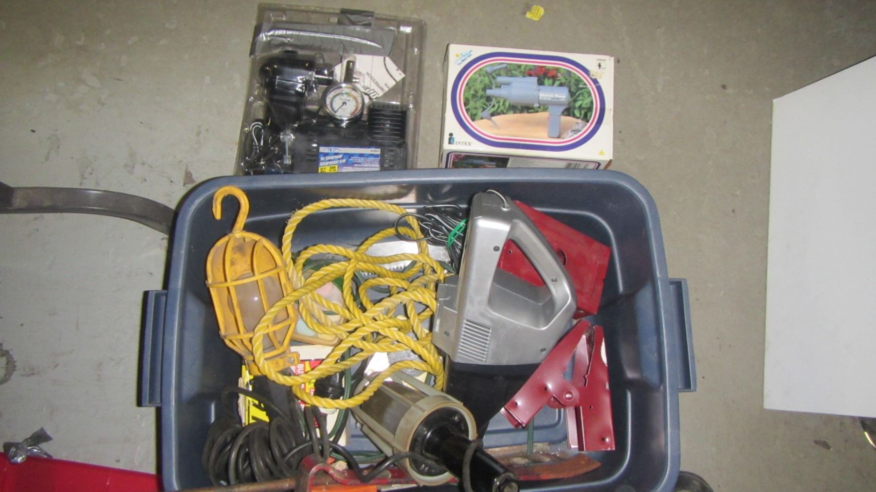 BIN OF MISC. VACUUM, MINI AIR COMPRESSOR, INFLATOR AIR PUMP, SAWHORSE BRACKETS, ETC.
