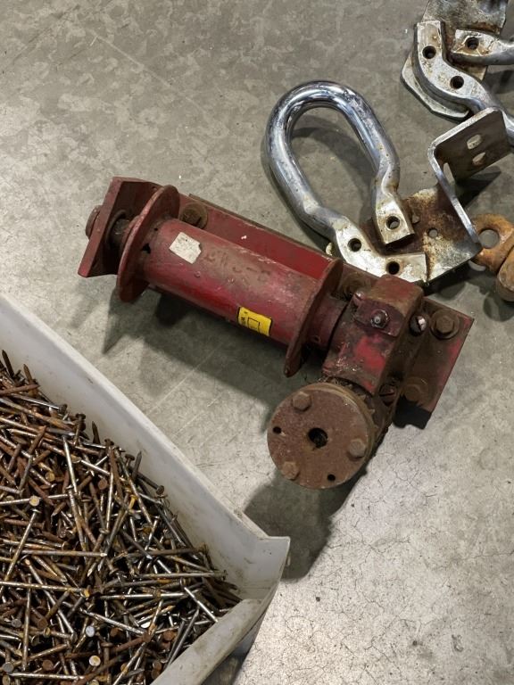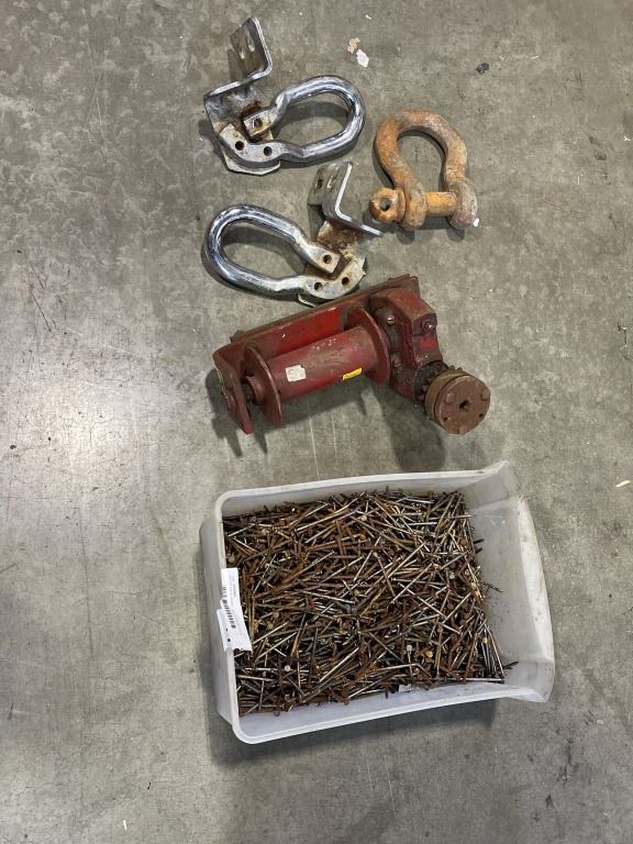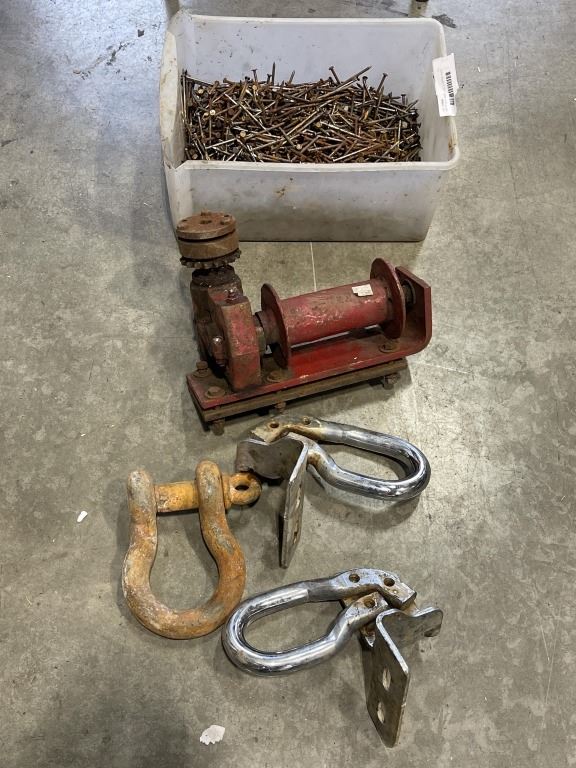 BIN OF NAILS, WINCH, AND 3 LARGE HOOK RINGS