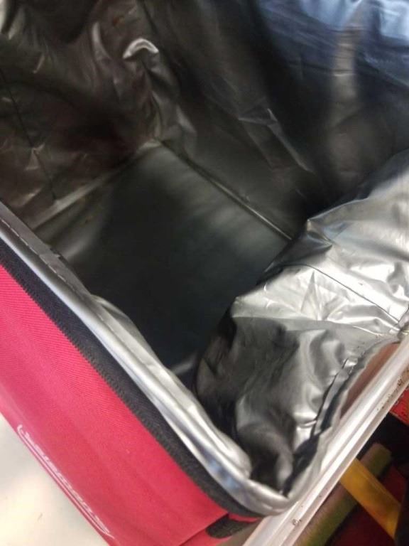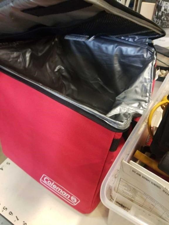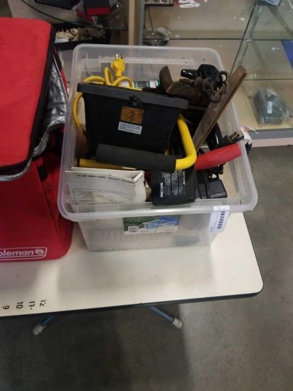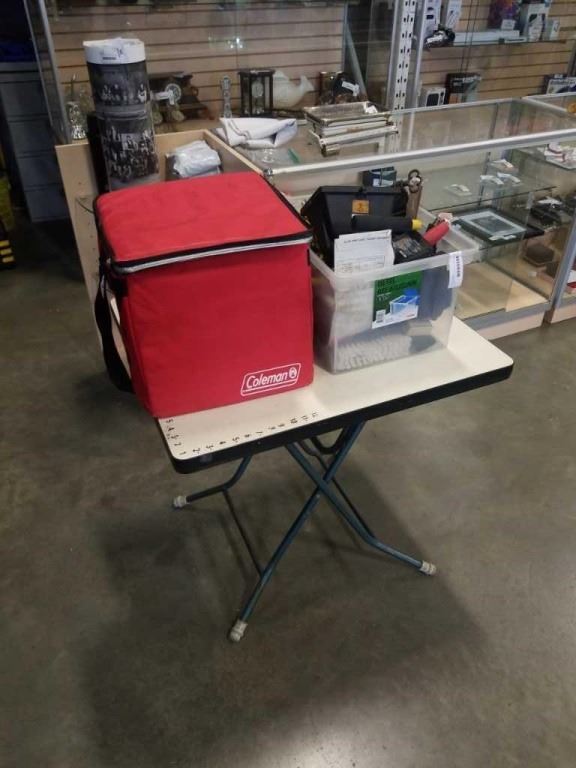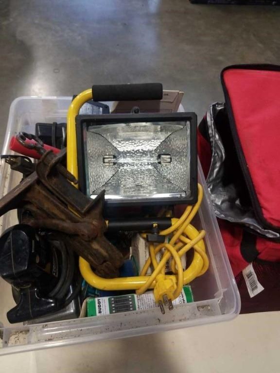 BIN OF SHOP SUPPLIES, TOOLS, COLEMAN COOLER BAG, SHOP LIGHT
