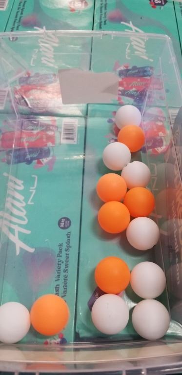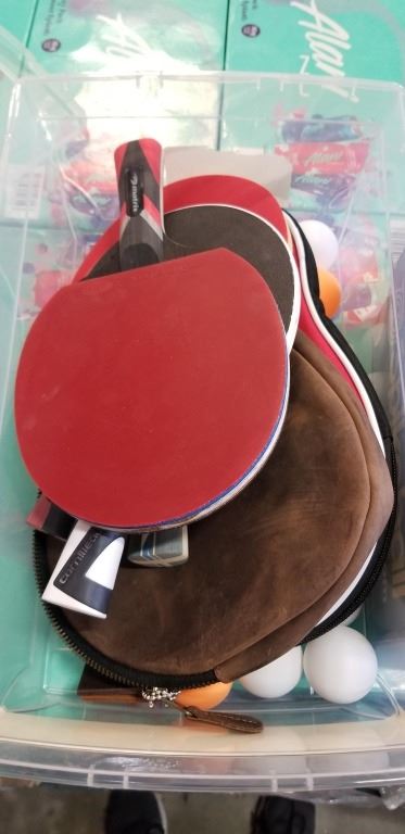 BIN OF TABLE TENNIS ACCESSORIES. AND SPIKEBALL GAME