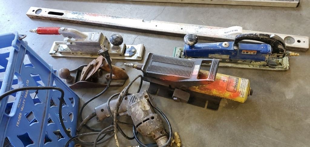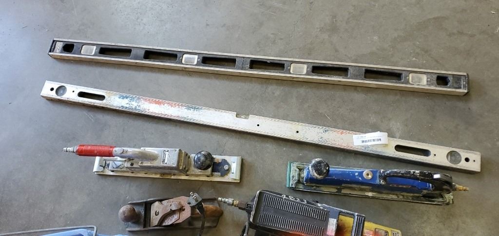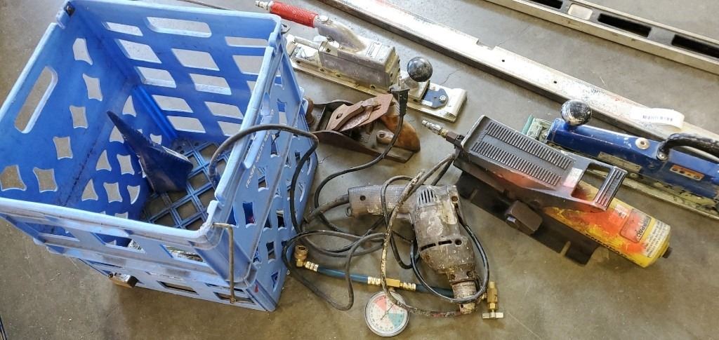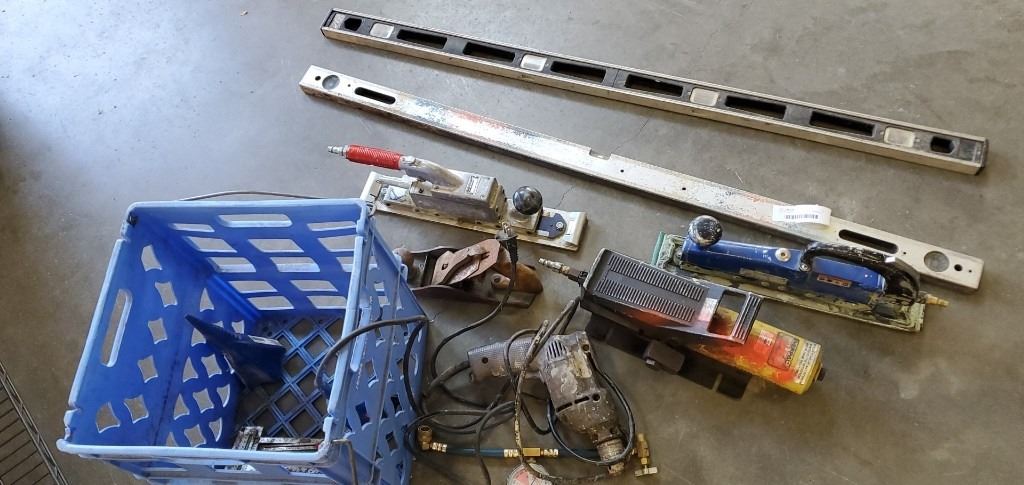 BIN OF TOOLS - AIR SANDERS, HYDRAULIC PUMP, AND 2 LEVELS