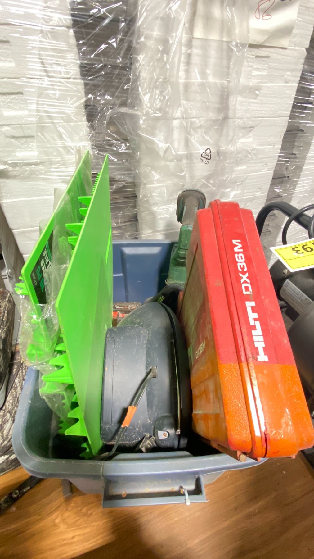 BIN OF WRENCH ORGANIZERS, CD PLAYER, & ASSORTED POWER TOOL PARTS *BIN INCLUDED*
