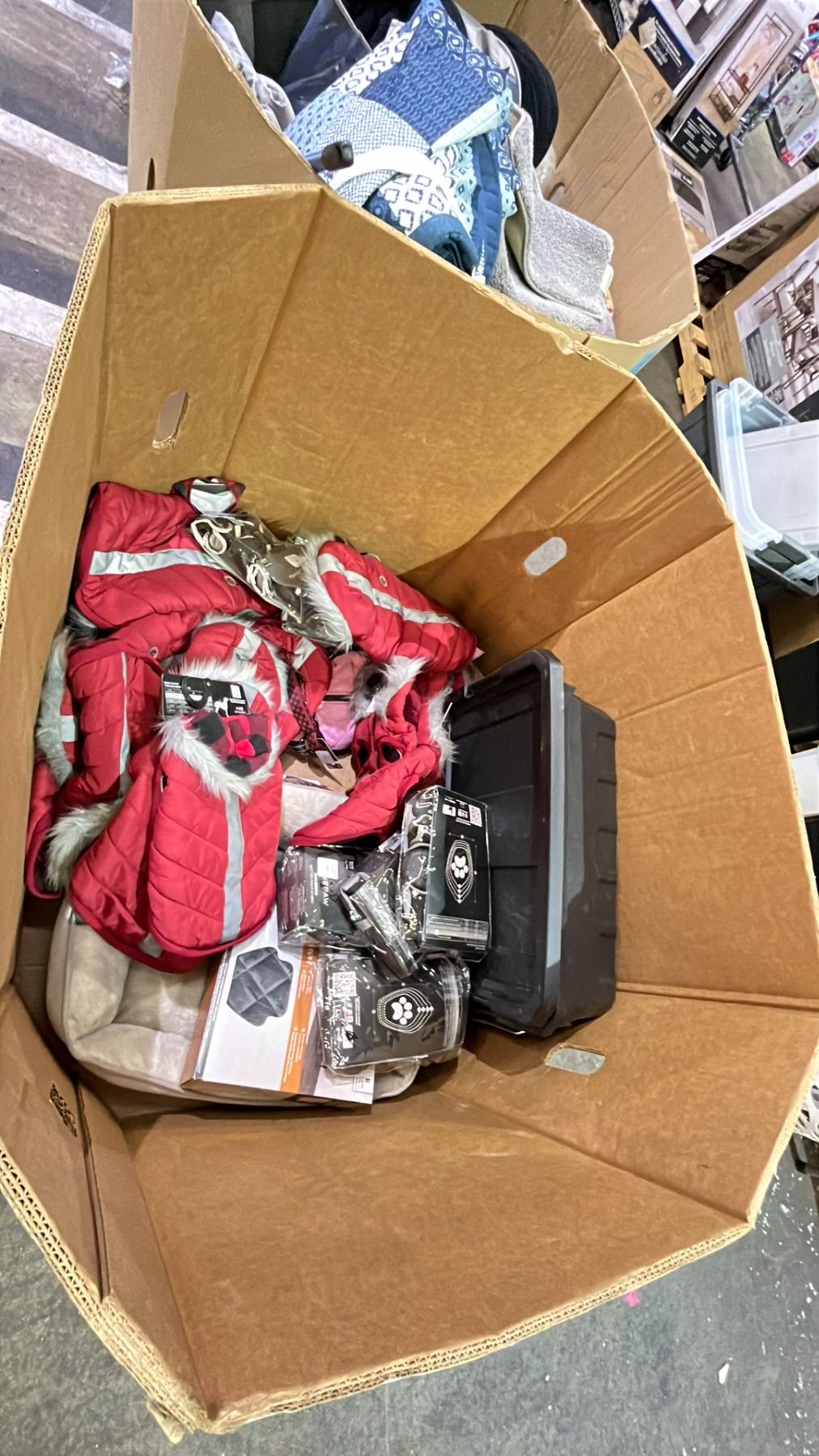 BIN OR VARIOUS ITEMS INCLUDING DOG JACKETS RED AND BLACKS COLOURS, DOG BEDS AND MORE