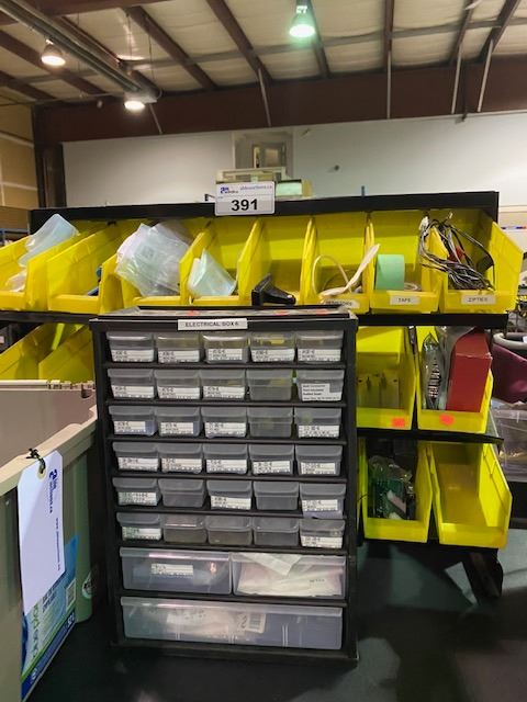 BIN ORGANIZER WITH 23 BINS AND ASSORTED ELECTRICAL AND ELECTRONIC PARTS WITH 33 DRAWER ORGANIZER WITH HARDWARE CONTENTS