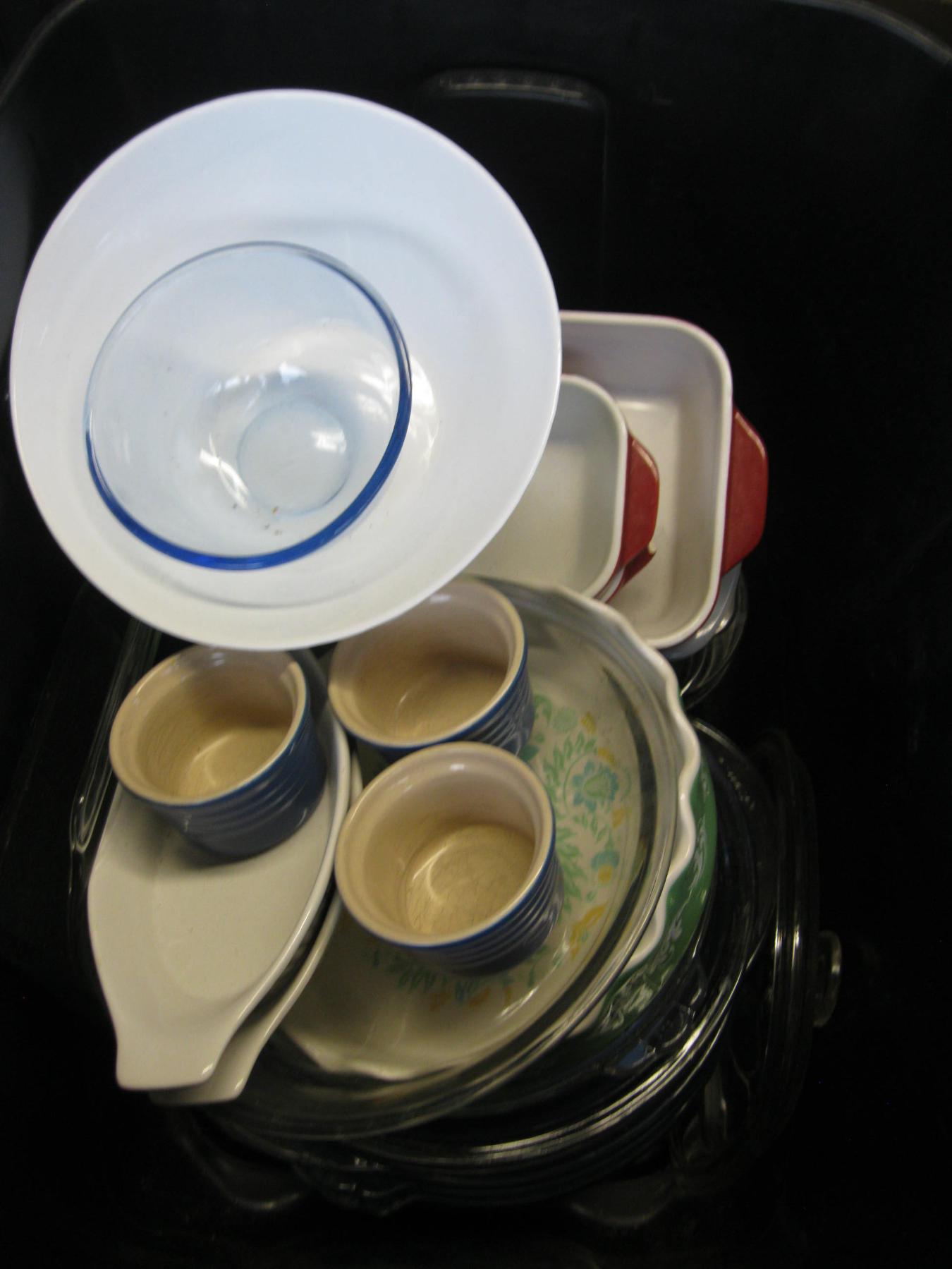 BIN W/ASST. GLASS BAKING DISHES, ETC.