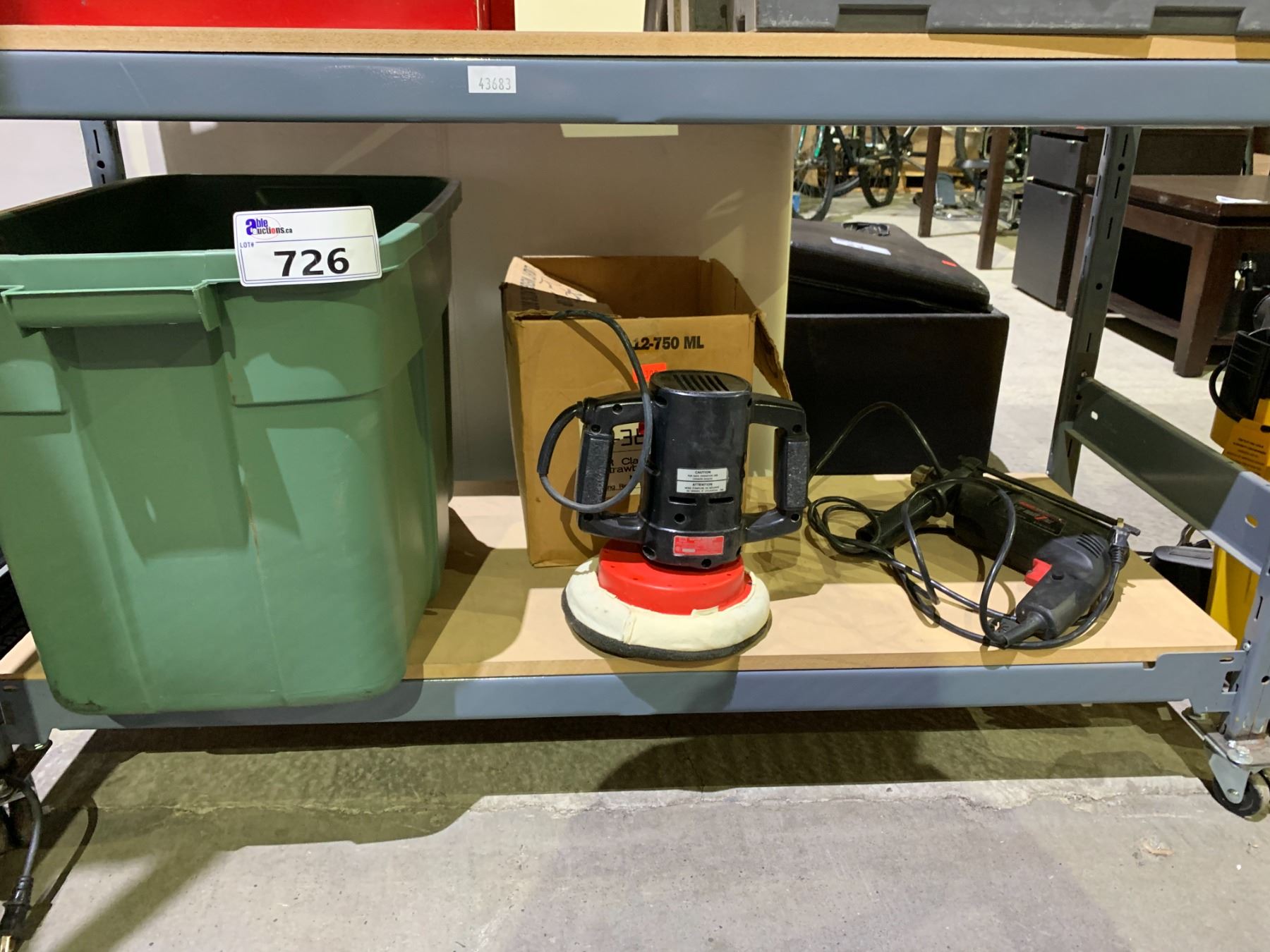 BIN WITH ASSORTED POWER TOOLS AND ACCESSORIES, BUFFER/POLISHER AND CRAFTSMAN DRILL
