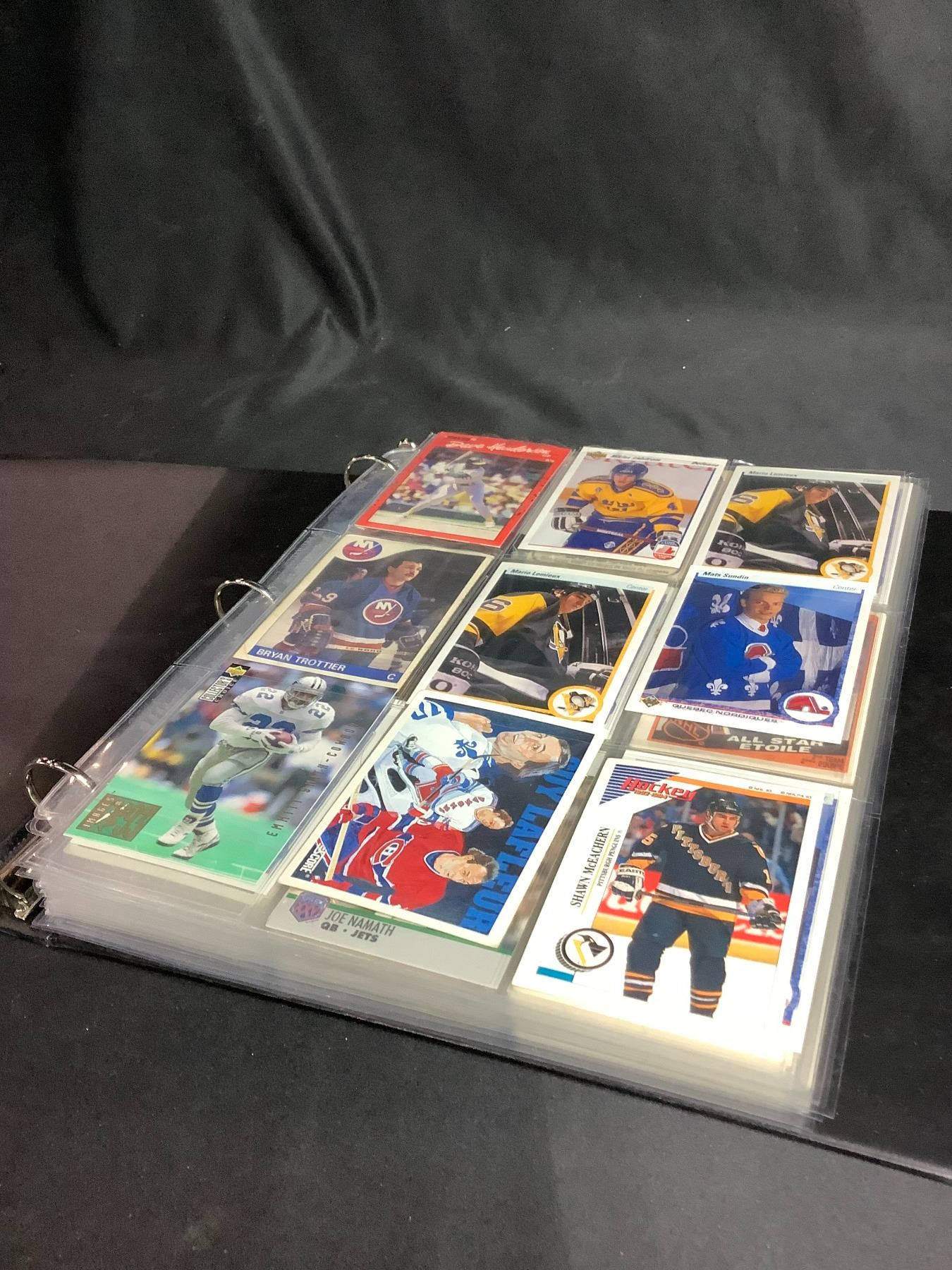 BINDER OF ASSORTED FOOTBALL, HOCKEY AND BASEBALL CARDS