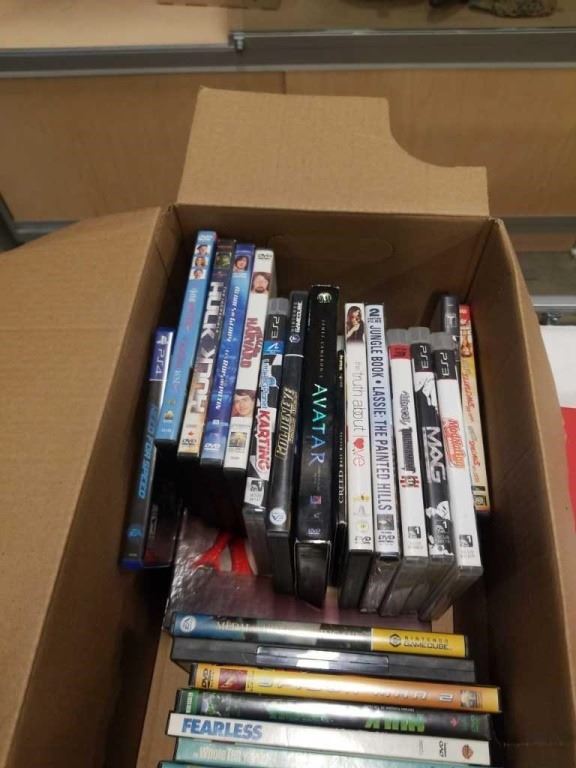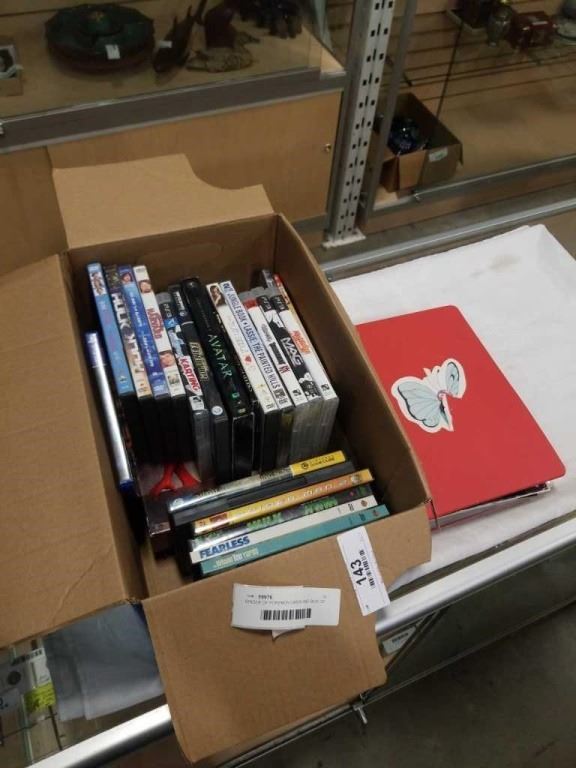 BINDER OF POKEMON CARDS AND BOX OF DVDS AND VIDEOGAMES