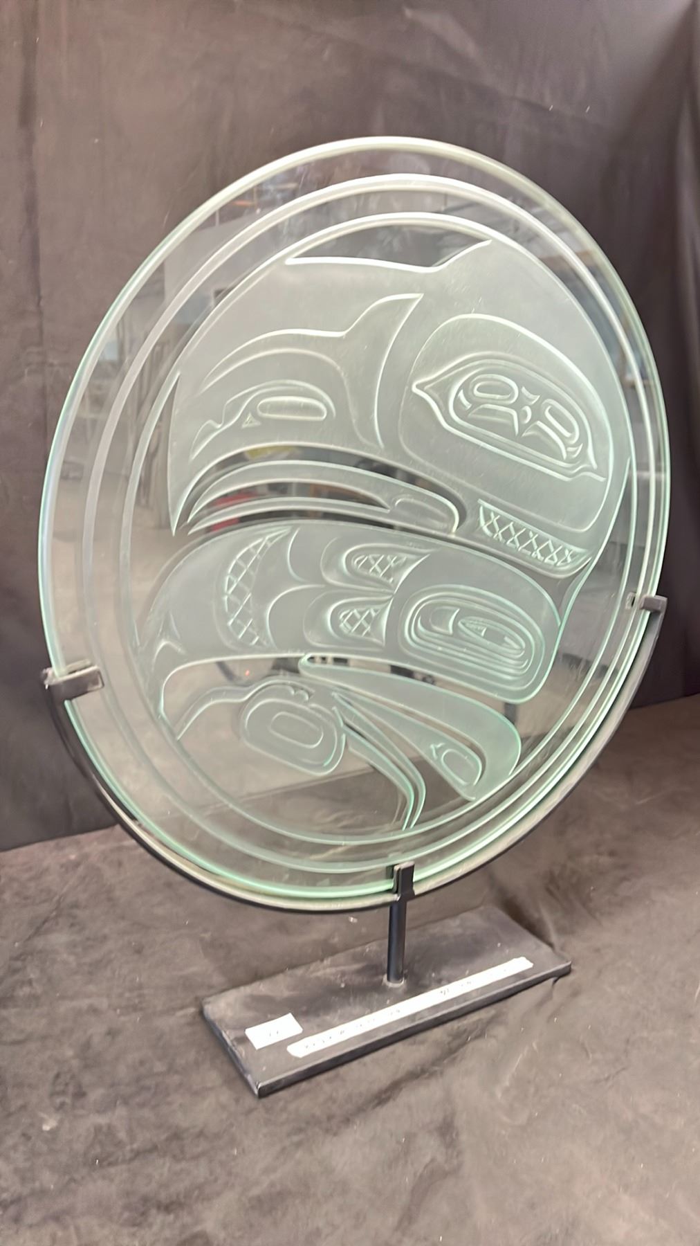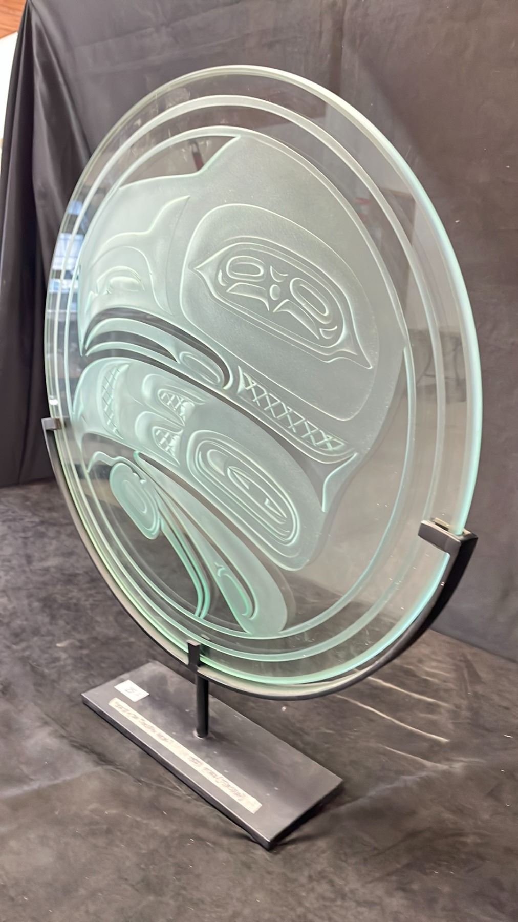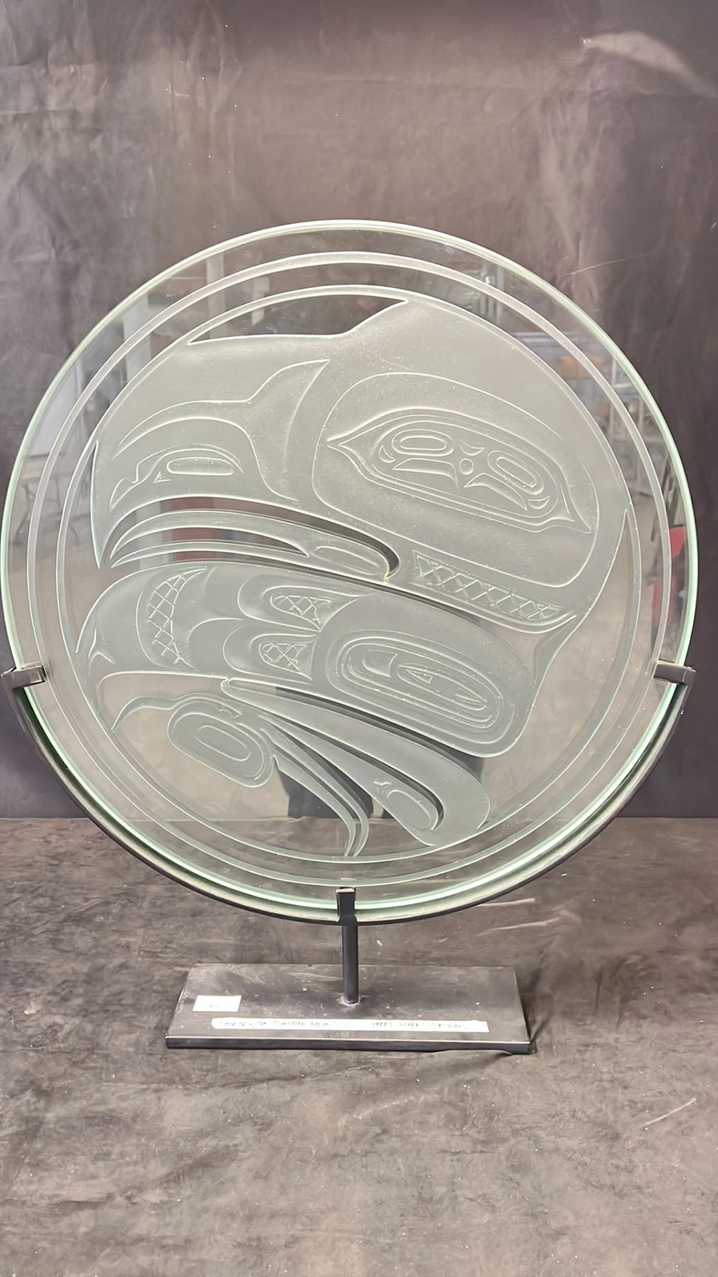 "BIRTH OF THE TSIMSHIAN NATION" APPROX 20" PANEL IN GLASS OVER PAINTED STEEL BASE BY TERRY STARR (TSIMSHIAN)