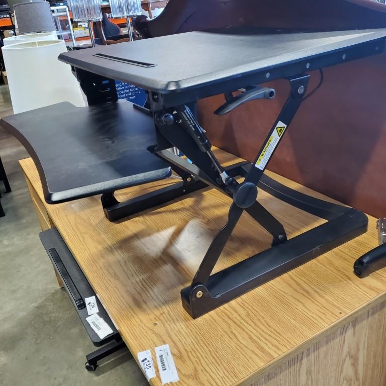 BLACK ADJUSTABLE GAS LIFT TABLE RISER WITH TRAY AND BLACK ADJUSTABLE TWO SECTION ONE TILT TABLE RISER IS $300+ FROM ULINE